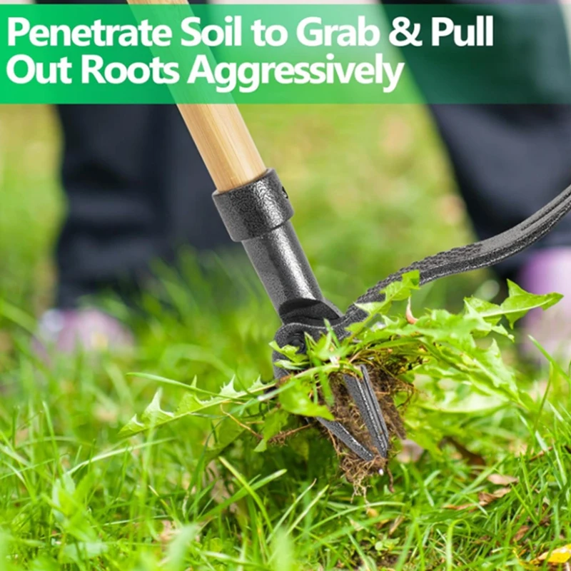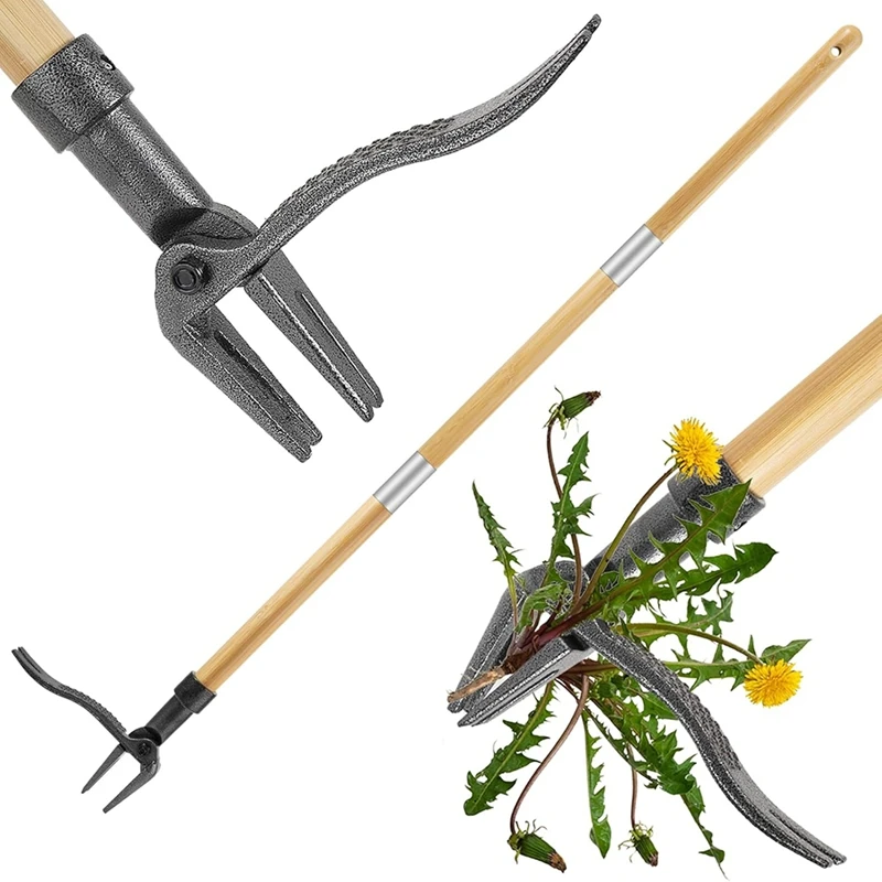 46 Inch Weed Puller Tool With Long Handle Bamboo Grip & 4 Claw Steel Head 3-Section Design For Stand Up Gardening Tool