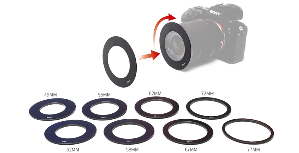 The TP2A with standard 49/52/55/58/62/67/72/77mm eight lens adapter rings. You can choose one which suit for your camera lens.