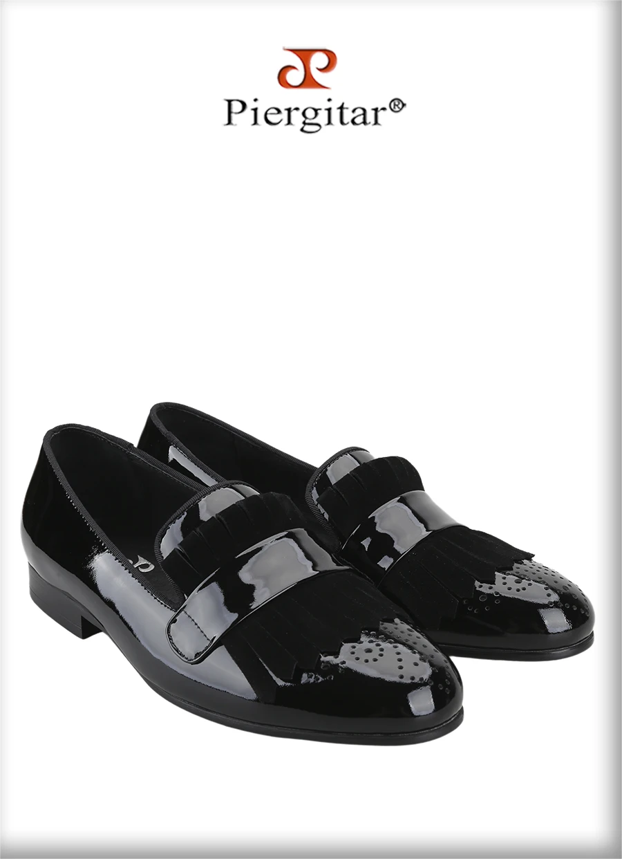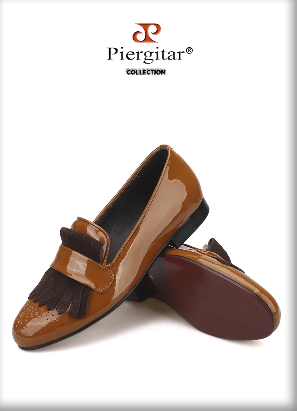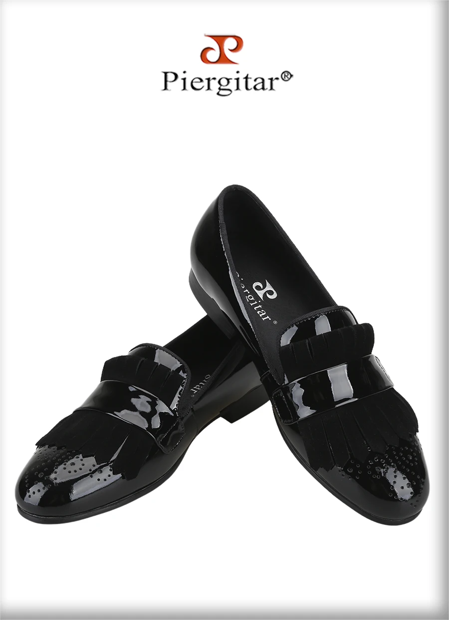 Piergitar New Style Handmade Patent Leather Shoes With Classical Brogue Printing And Suede Fringe Party/Wedding Men's Loafers