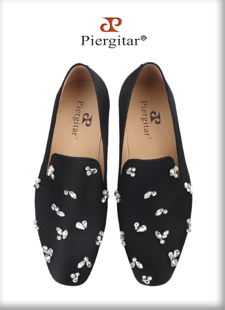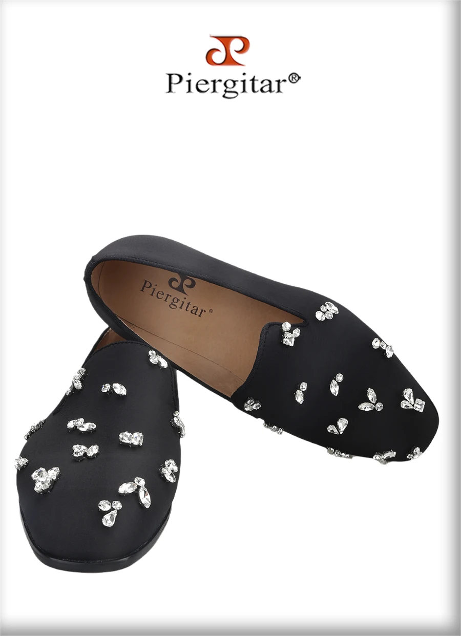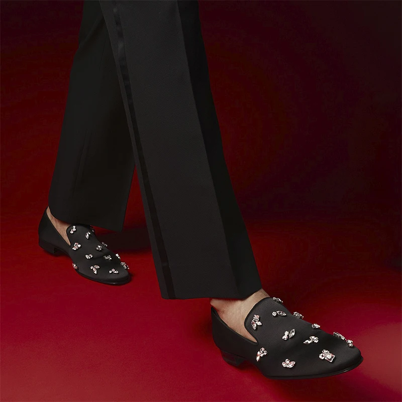 The same design red outsole moccasins with a smooth black crepe satin men's loafer.