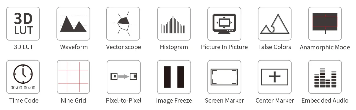 The monitor provides a series professional auxiliary monitoring tools, such as waveform, 3D-LUT, peaking filter, histogram, vectorscope, audio meter, time code, anamorphic mode, etc. All of functions can easy to select and operate from menu, also can set shortcut button or via GPI control. Effectively improve the efficiency of on-site shooting and post-production.