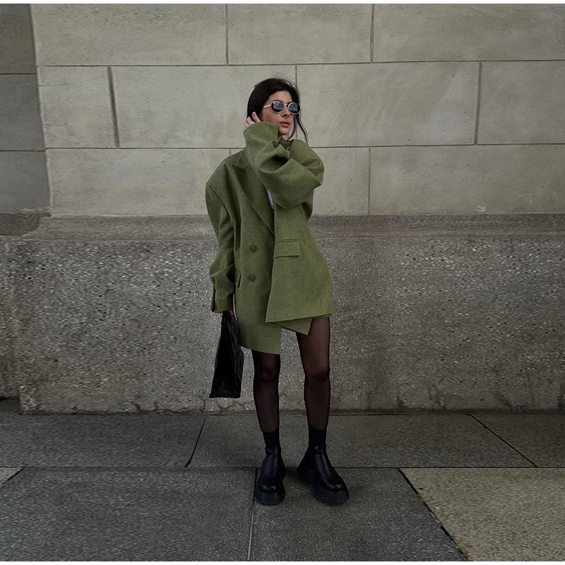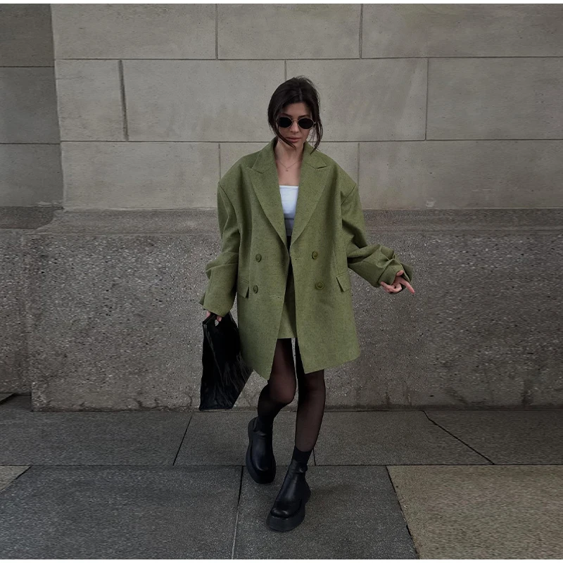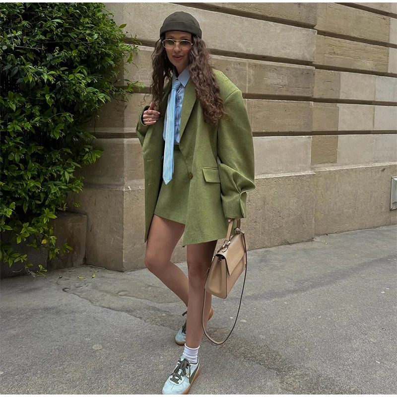 2. Oversized Blazer Silhouette:The loose, boxy blazer brings a cool, effortless street-style vibe.