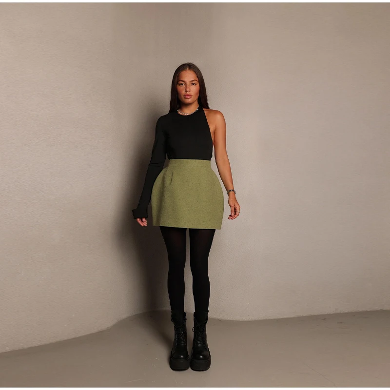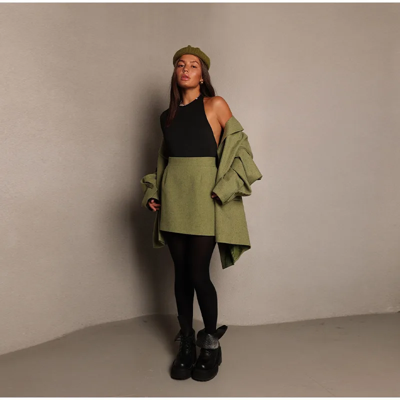 1. Chic Color Blocking:Matching green blazer & skirt with a light blue shirt creates a stylish, coordinated look.