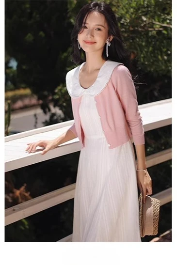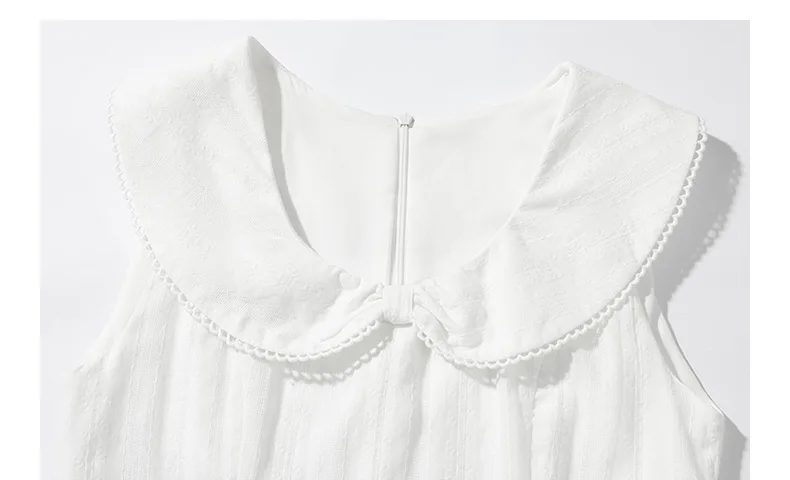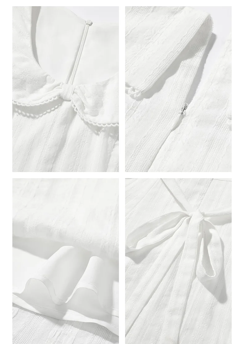 Add a charming touch to your summer look with this white jacquard dress, designed with a flattering A-line silhouette and playful bow tie detail. Crafted from lightweight, breathable fabric, this dress offers a soft texture and gentle drape, ideal for warm days. The sleeveless cut and oversized peter pan collar enhance its sweet and youthful appeal, while the adjustable waist tie ensures a comfortable fit for petite frames. Whether you're heading to a garden party, vacation stroll, or casual day out, this feminine and versatile dress pairs effortlessly with sandals or ballet flats for a graceful finish.