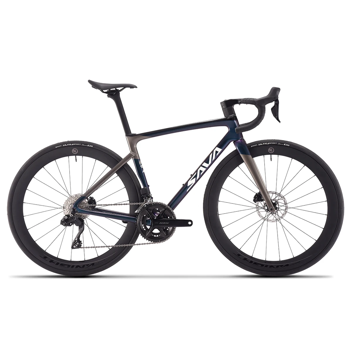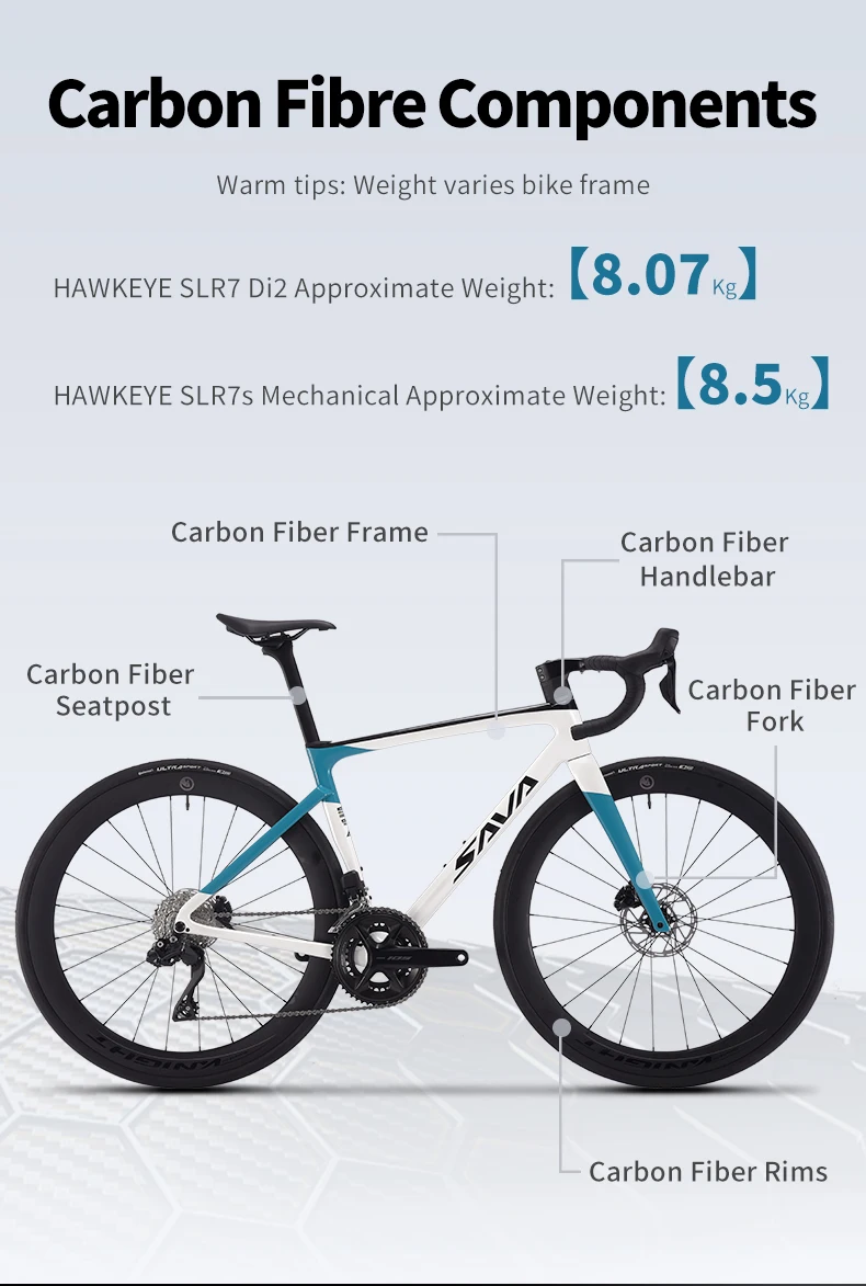 HawkeyeSLR7-S with carbon fiber handlebars, aluminum wheels and the rest of the bike is carbon fiber.