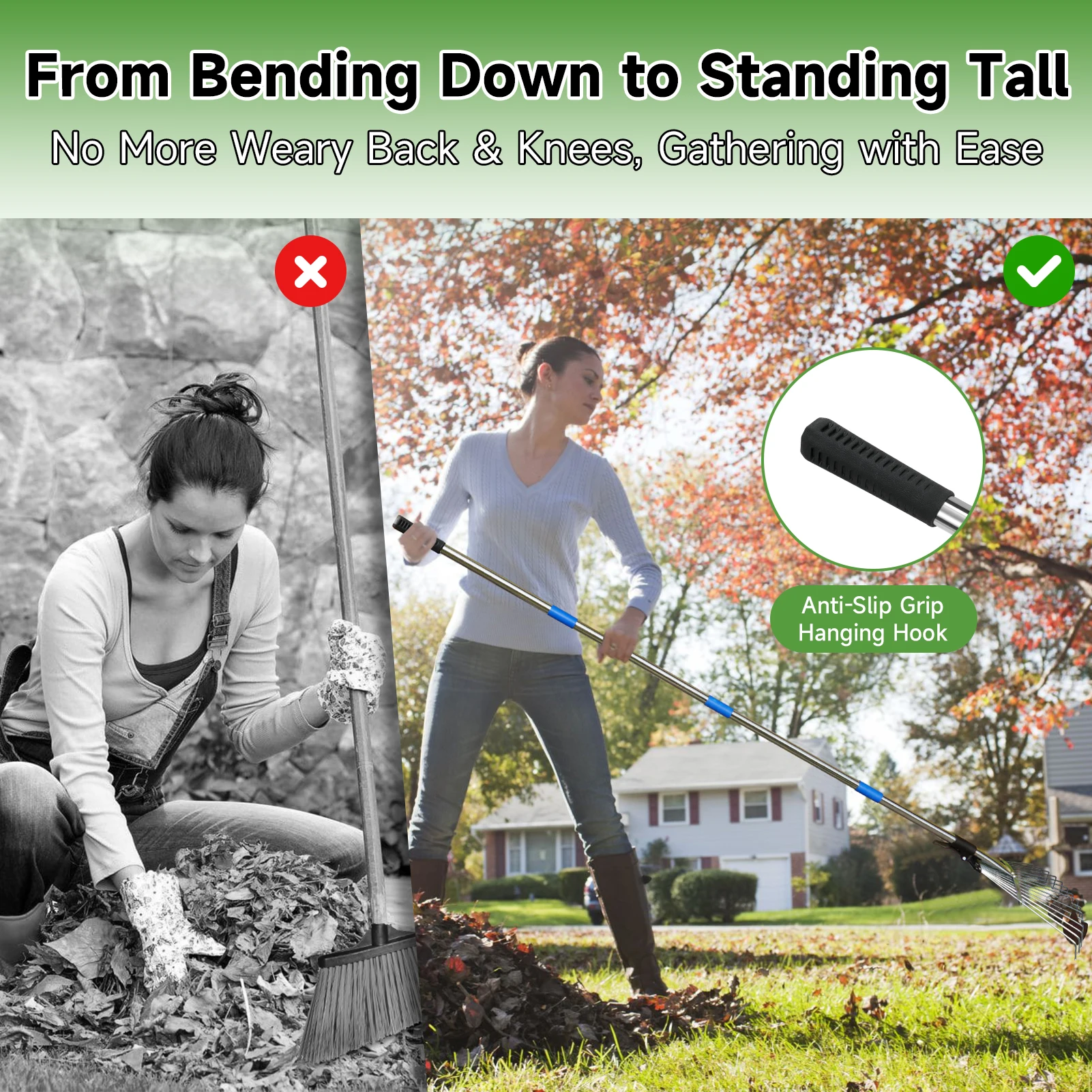 Modern Design: Our Leaf Rake combines style with function, featuring a modern design, blunt-tipped tines, and slightly larger holes on the width bar for gentle use. Elevate your lawn care routine!