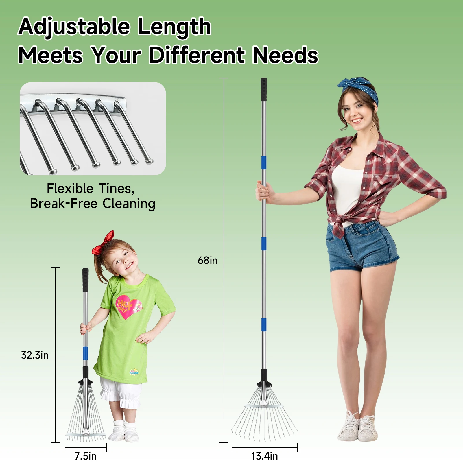 Adaptable Convenience: This yard rake features a length-adjustable handle ranging from 32.3" to 68". There are width-adjustable tines for a customized and efficient lawn care experience.