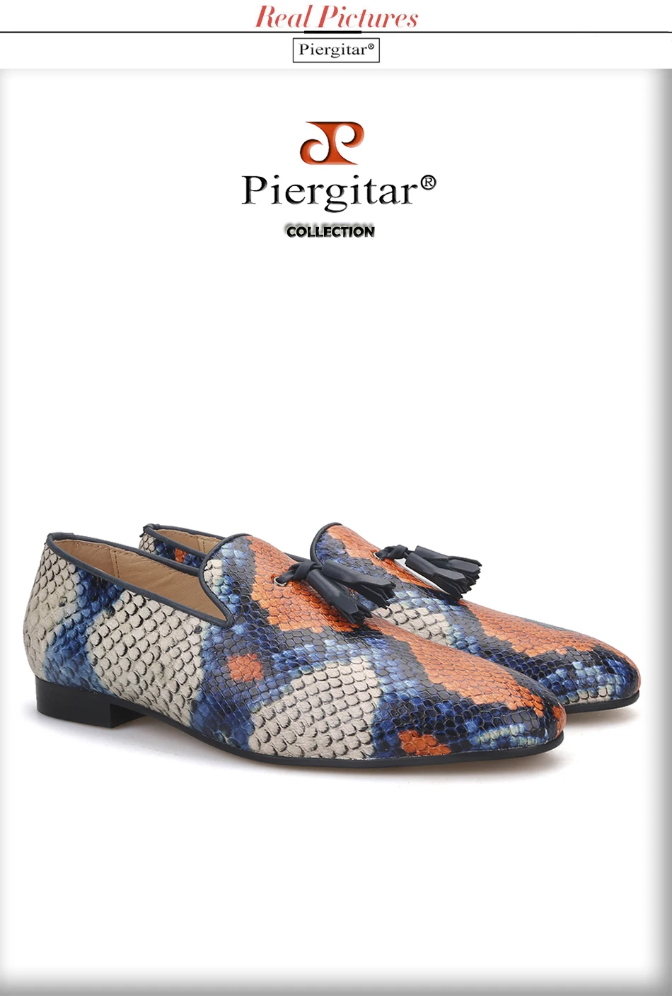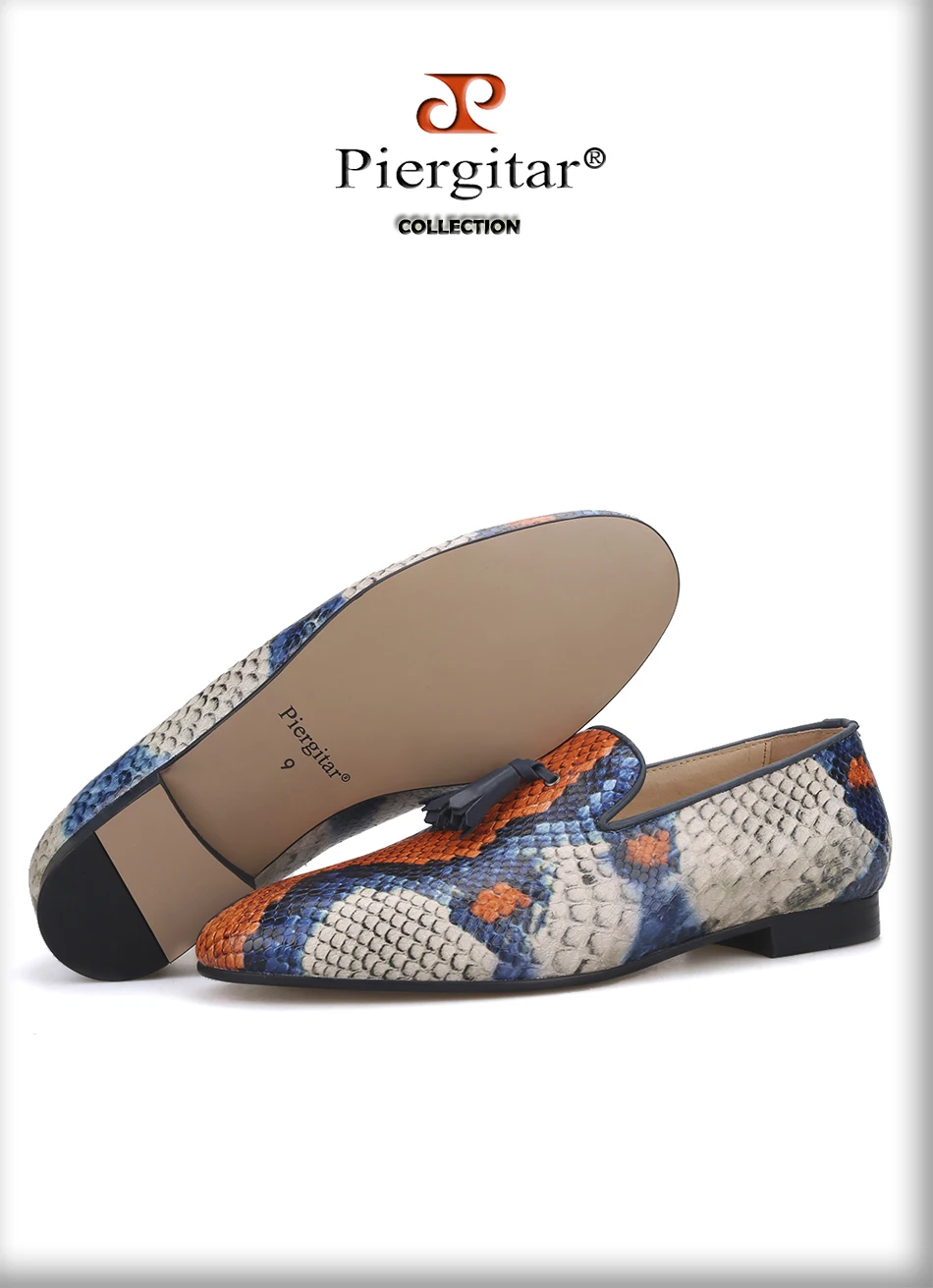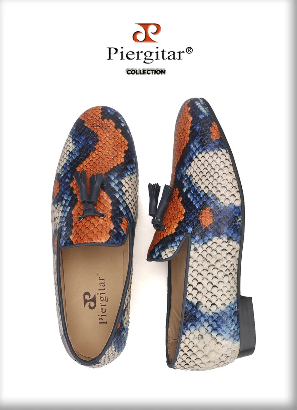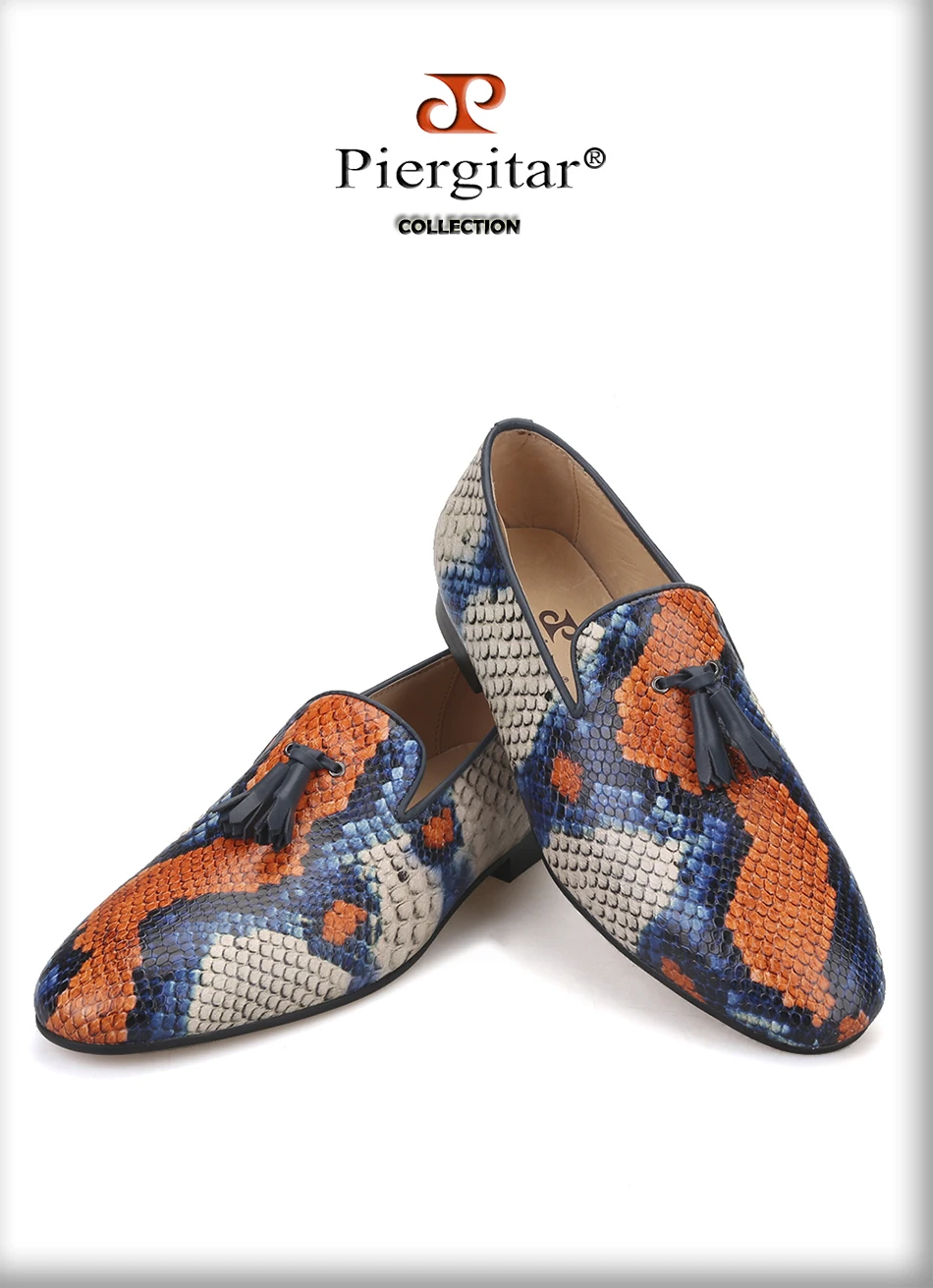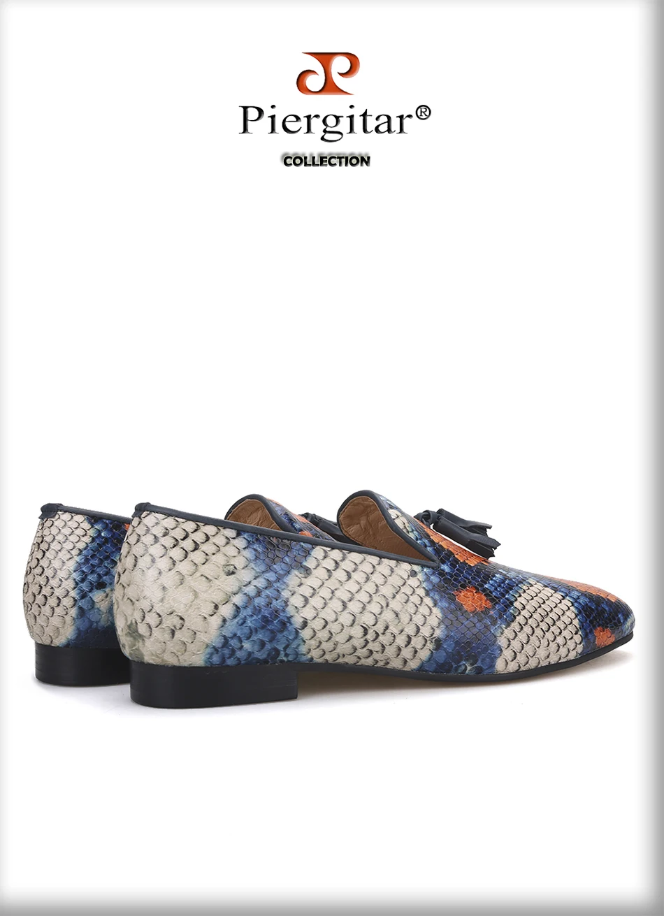 Men's casual shoes with tassels and cow leather in a snake pattern.