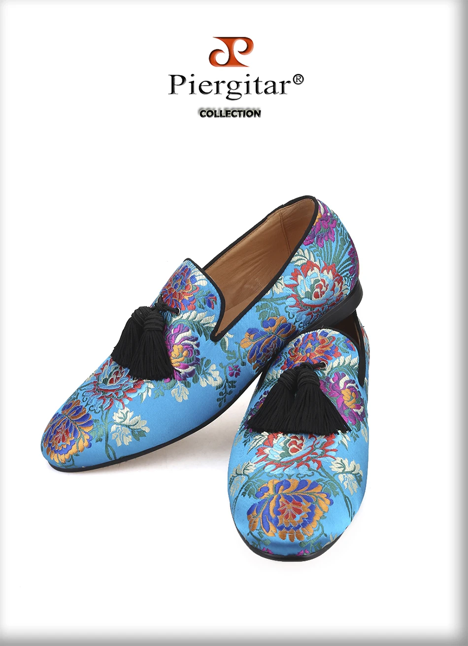 Piergitar brand 2019 new arrival Floral printing men loafers with big tassel wedding and prom men's silk shoes smoking slippers