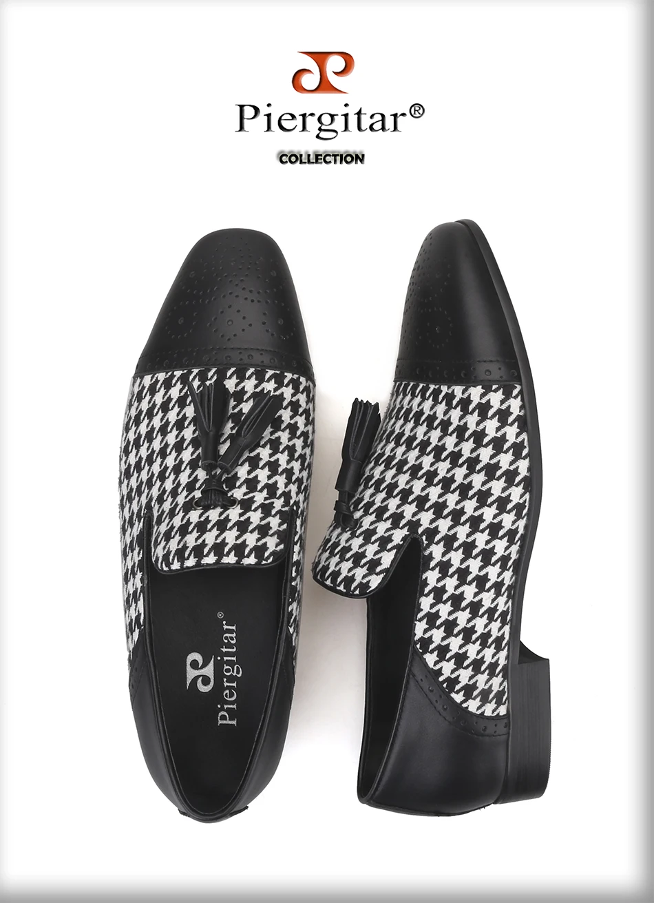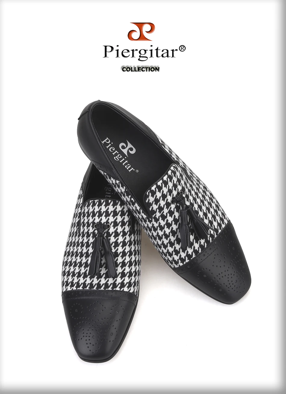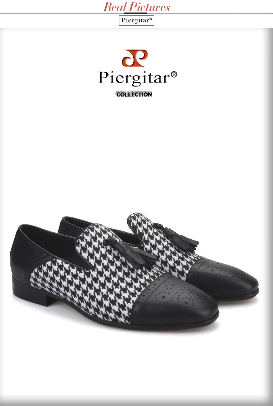 Piergitar brand new design houndstooth pattern men tassel shoes handmade men's loafers for party and prom men smoking slipper