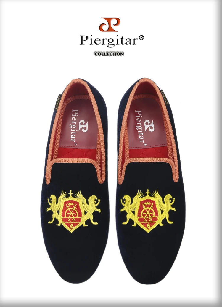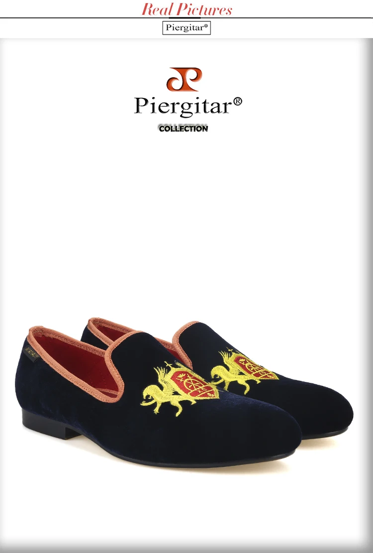 Piergitar British Style Embroidery Navy Velvet Shoes With Gold Outsole Handmade Men Loafers Slip-On Smoking Slippers For Party