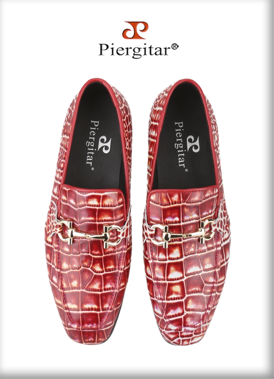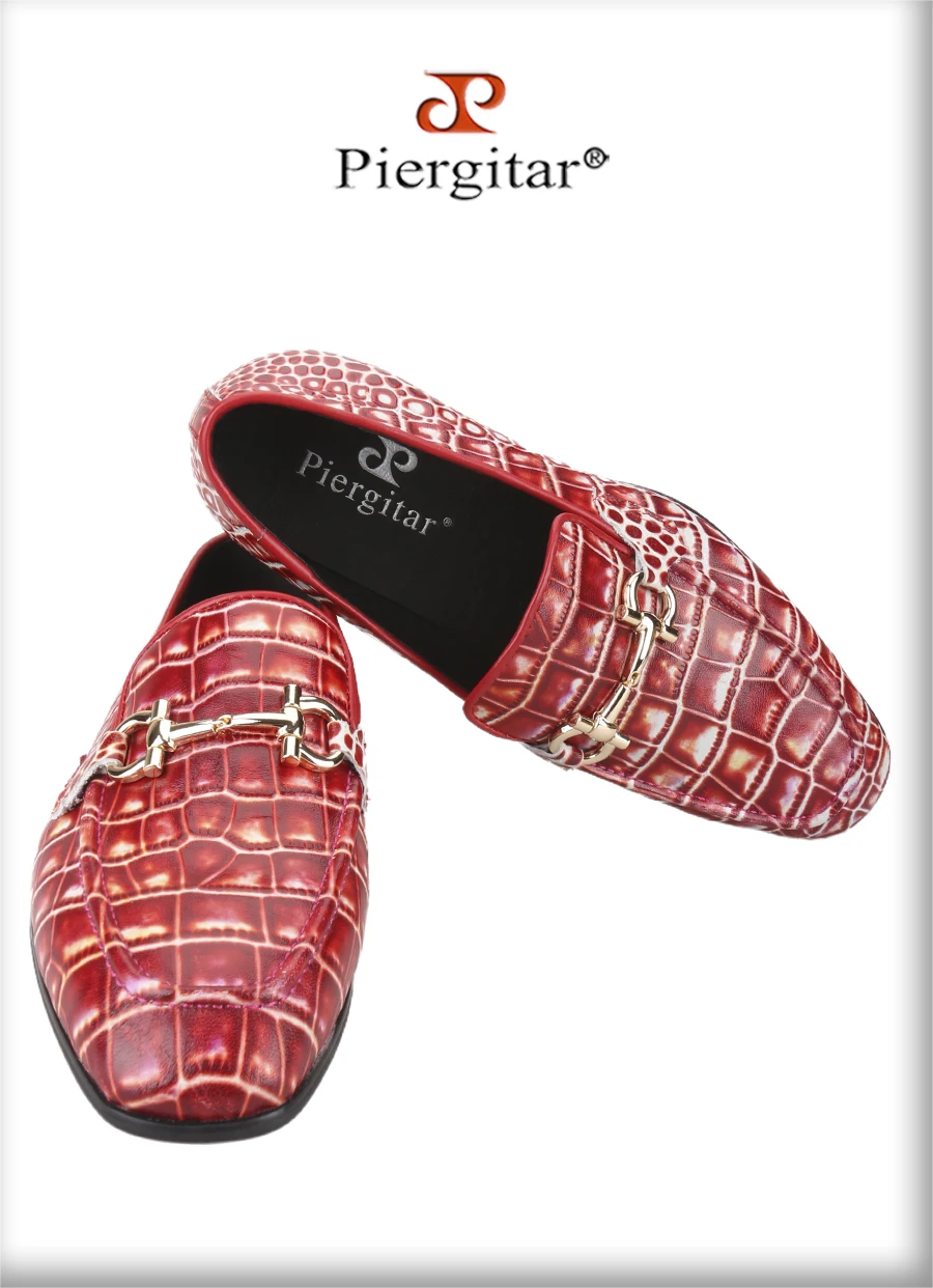 Piergitar Classic Model Gold Horsebits Men's Loafers Red And Light Green Crocodile Pattern Calfskin Handmade Slip-On Slippers