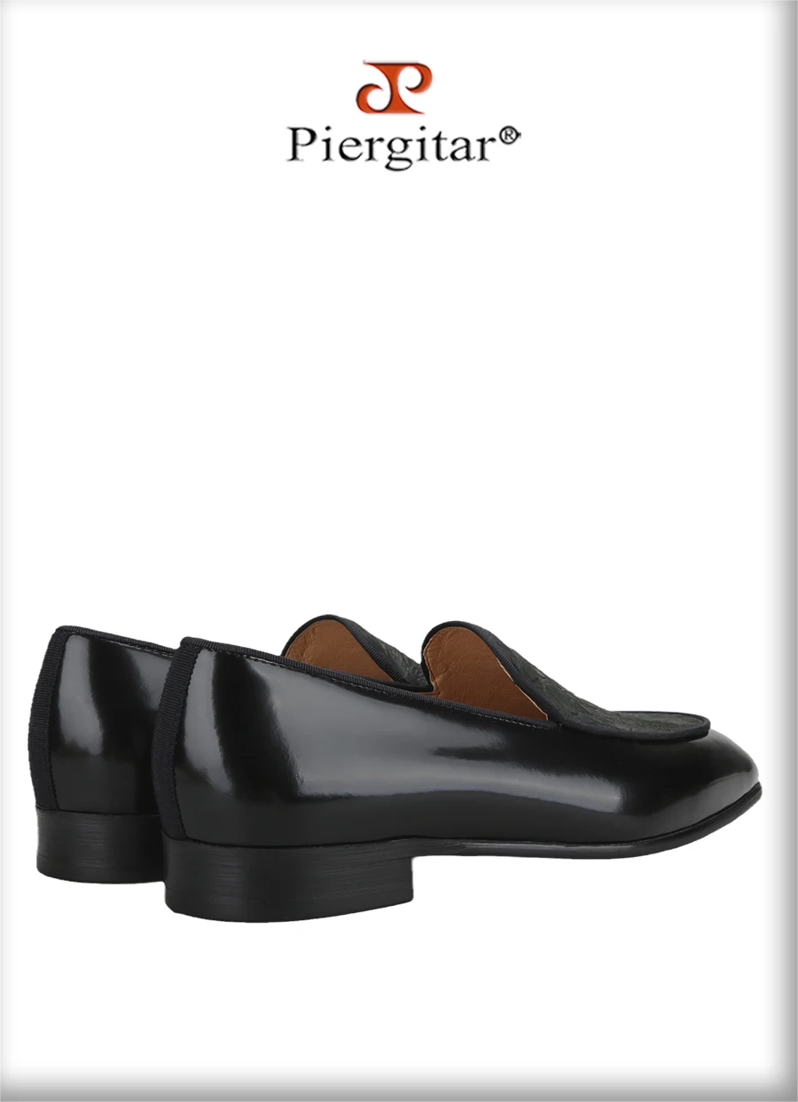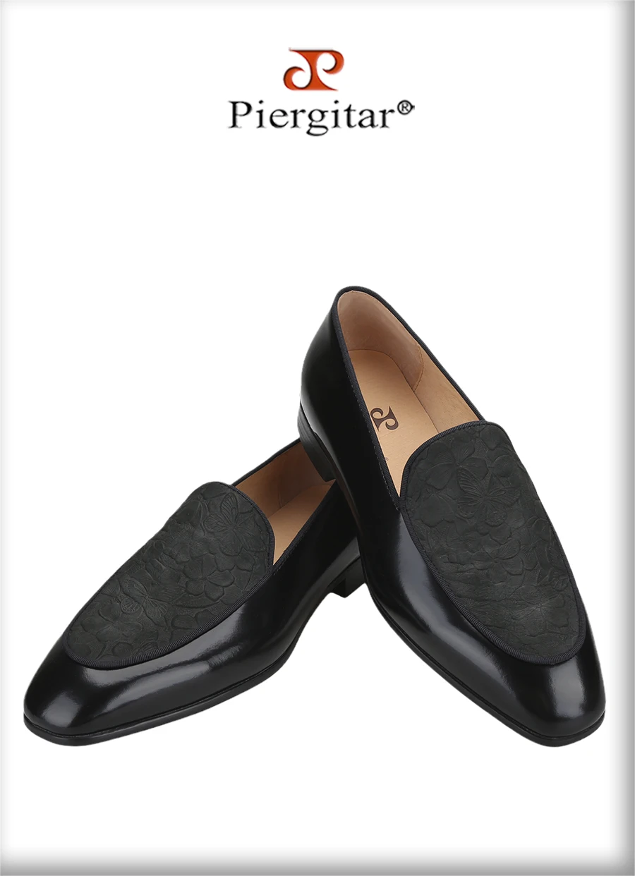 Piergitar Flower Pattern Embossed Leather Patchwork With Black Calfskin Men's Loafers Handmade Slip-On Slippers Red Bottom Flats