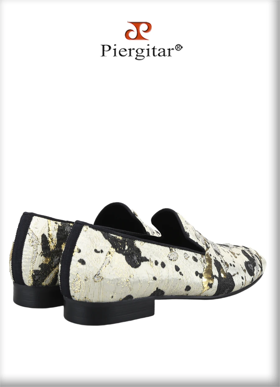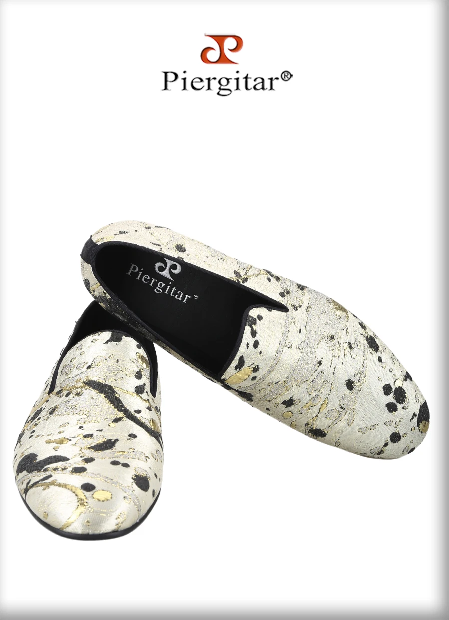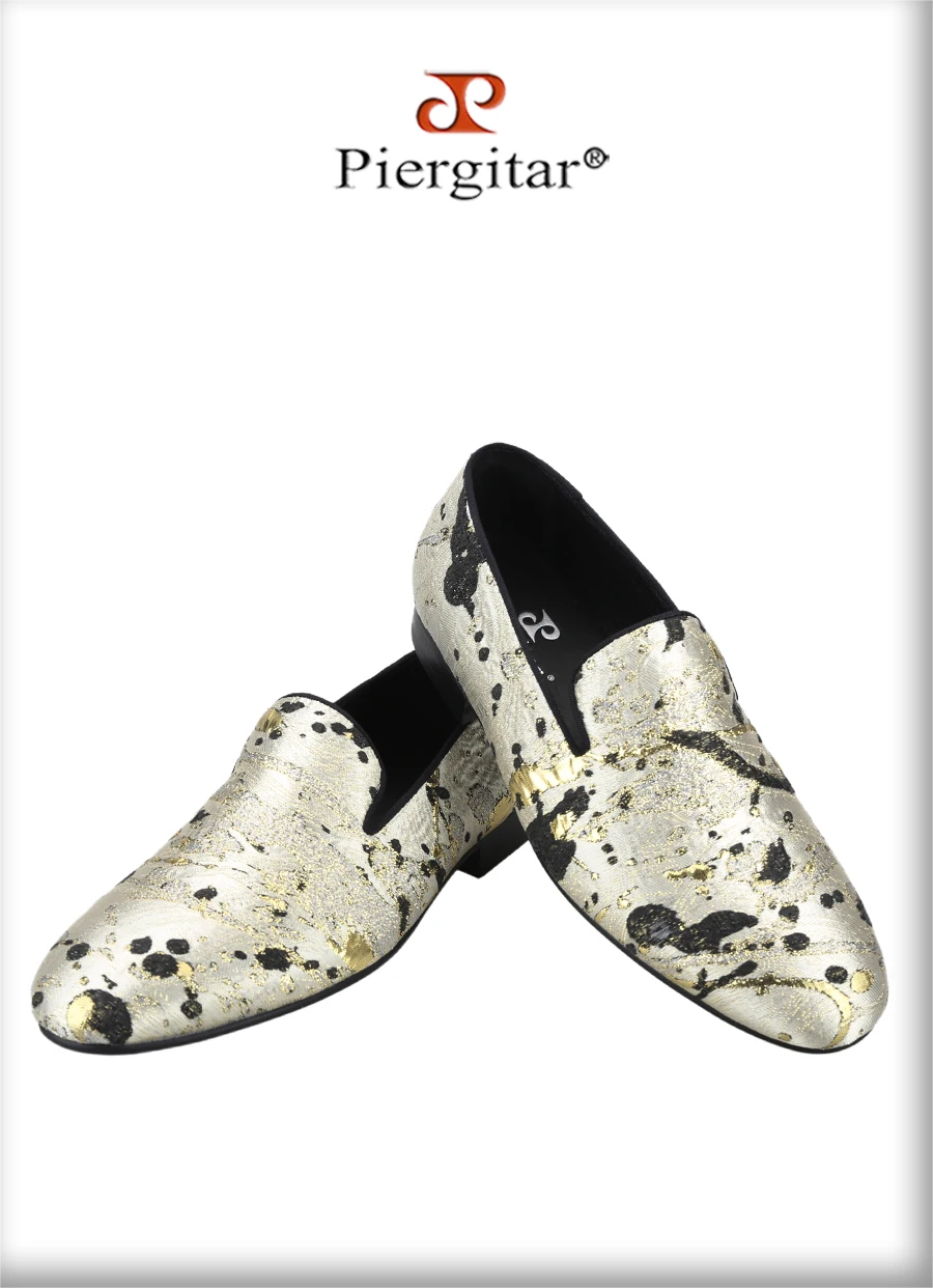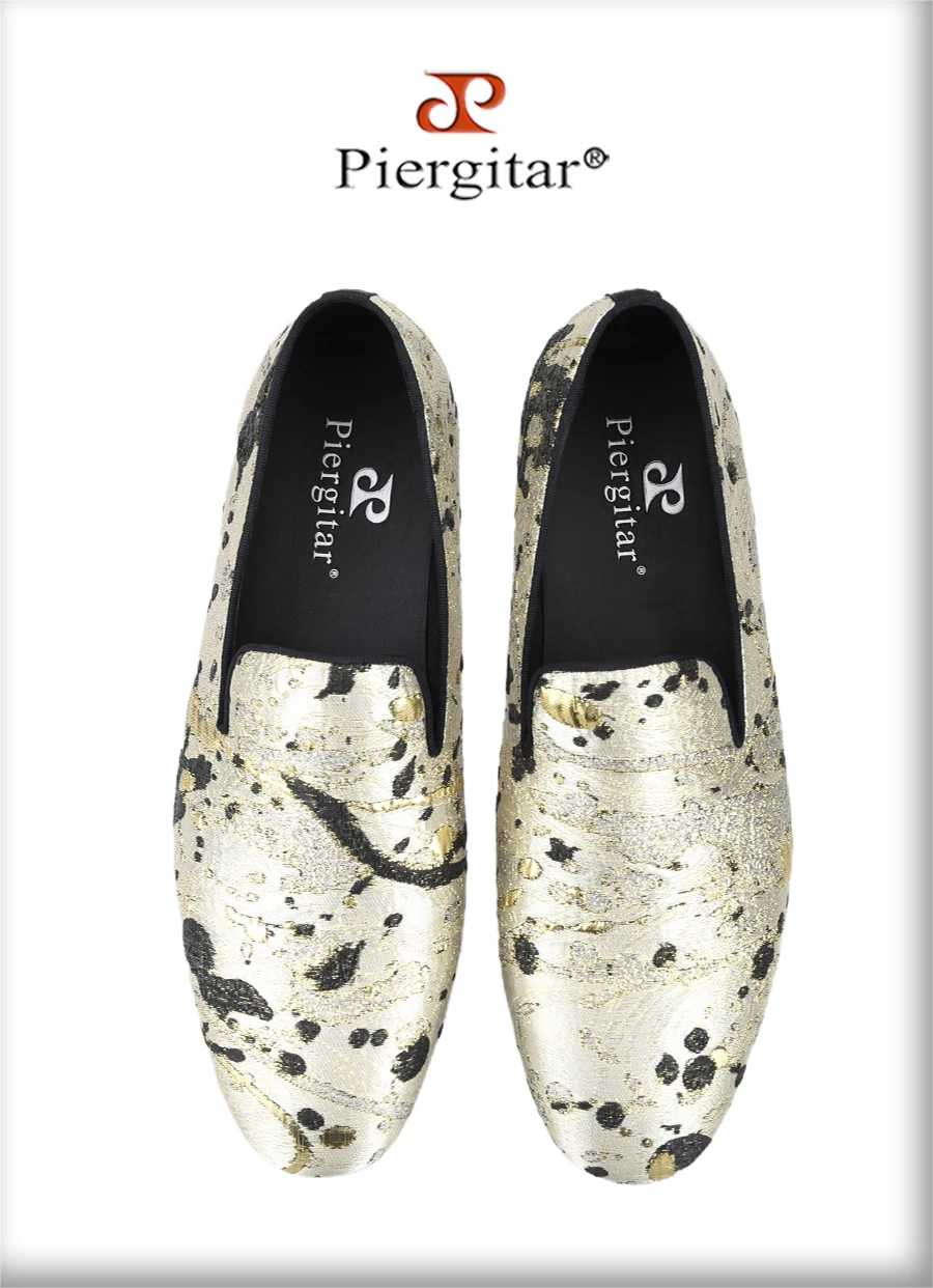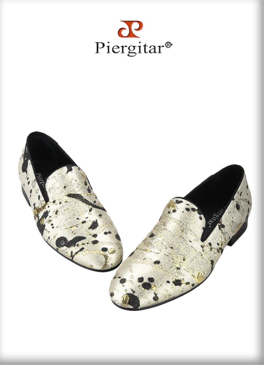 Piergitar Gold Color Ink Embossed Silk Men's Loafers Slip-On Model Handmade Moccasins For Wedding Breathable Leather Insole