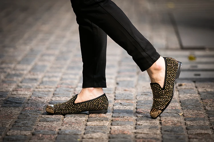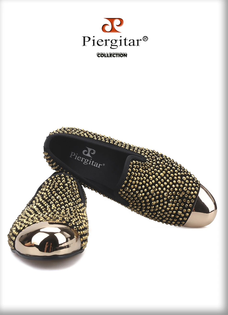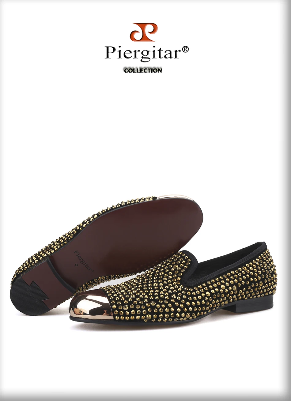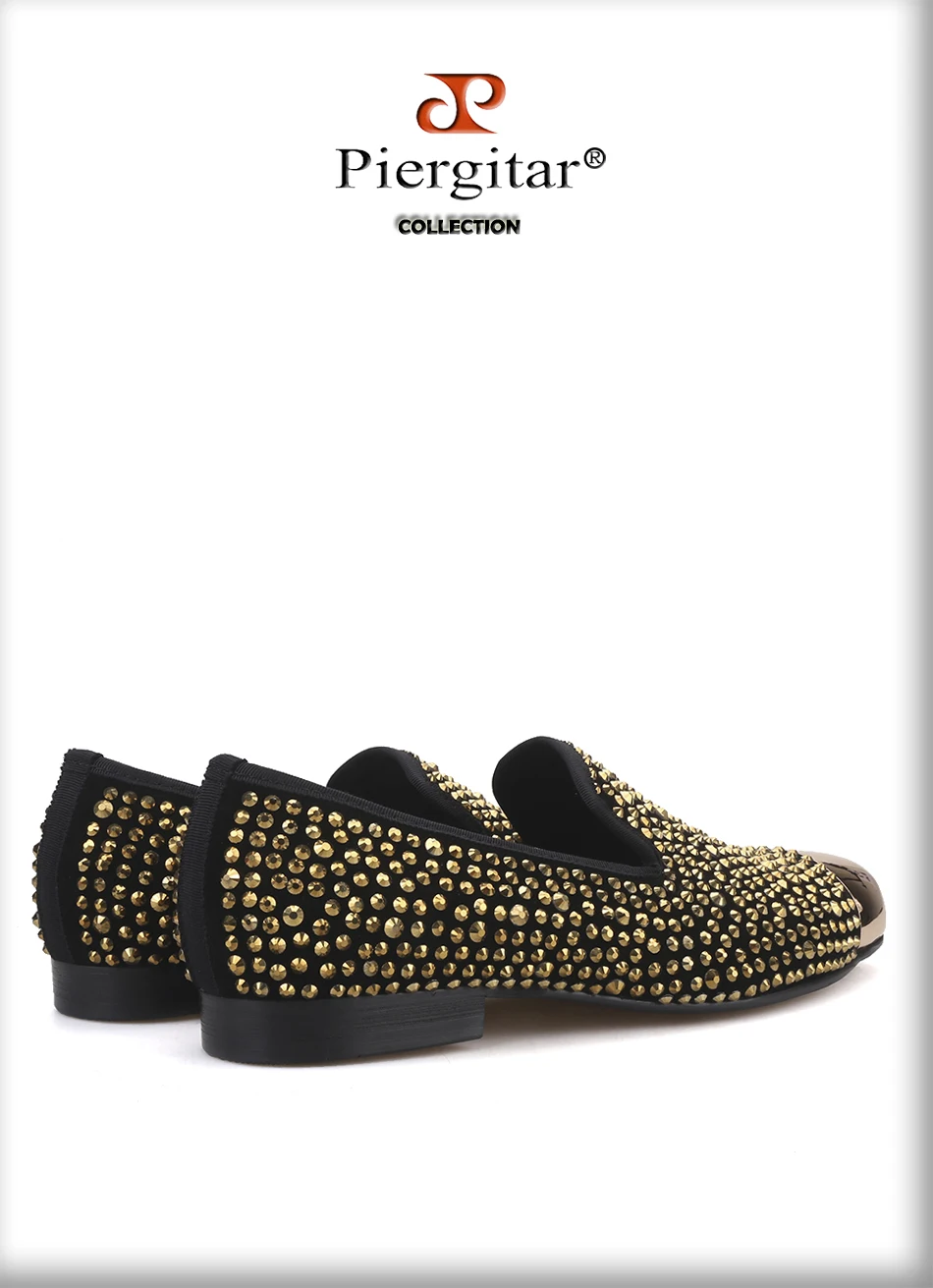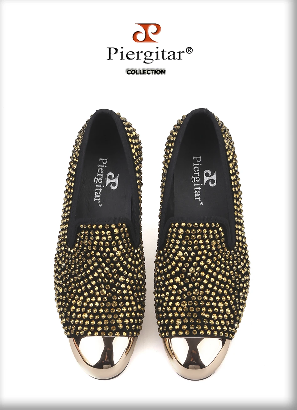 Piergitar gold metal toe and crystal men loafers handmade men's leather smoking slippers party and wedding men dress shoes