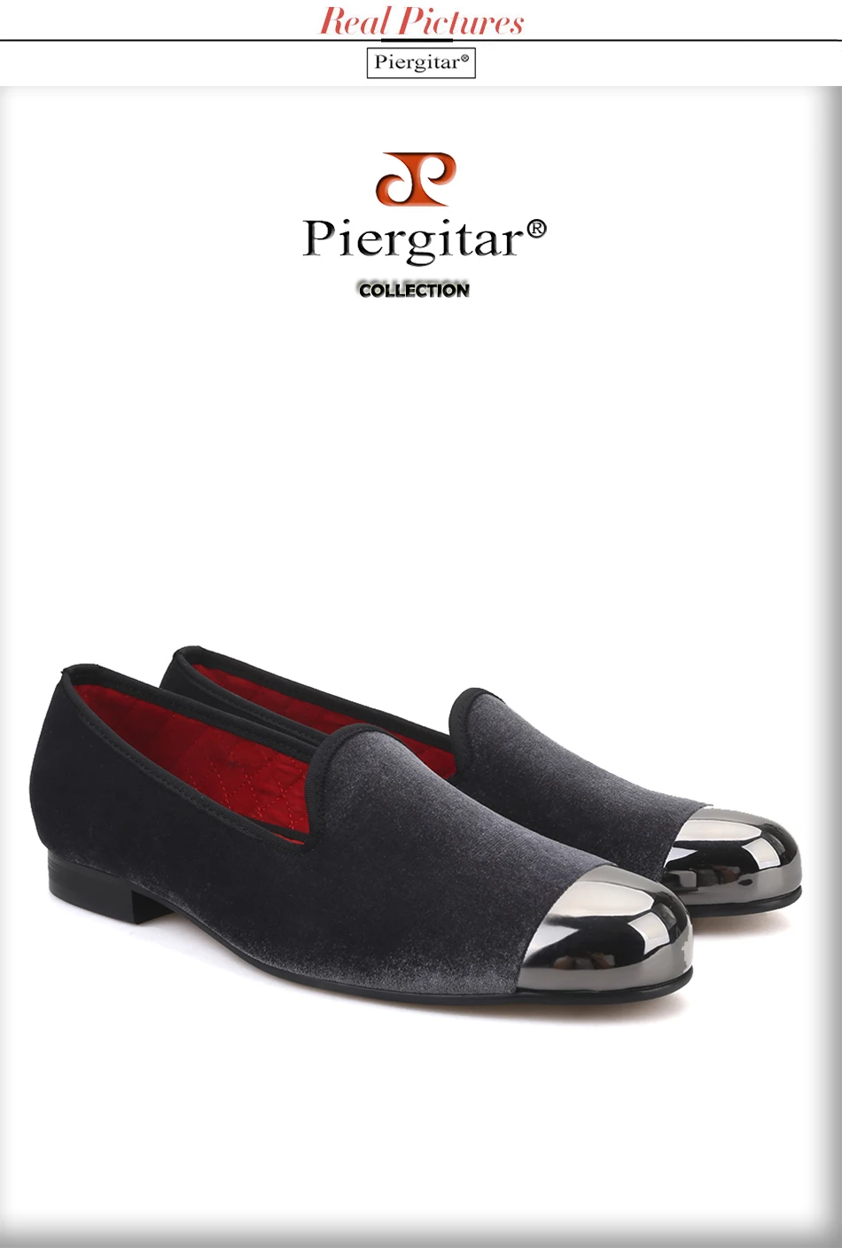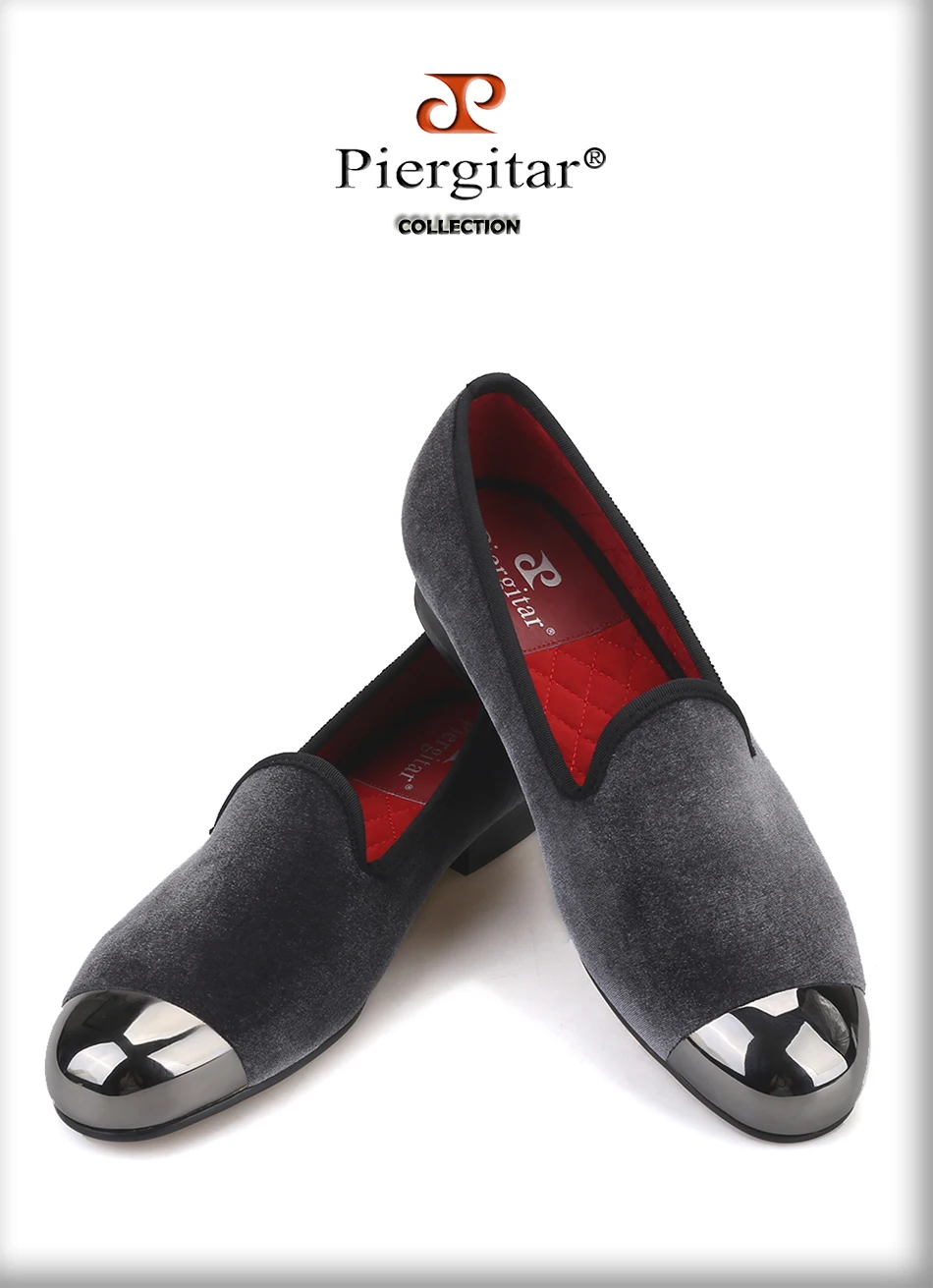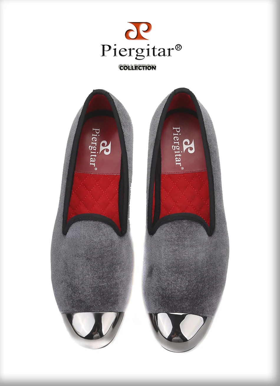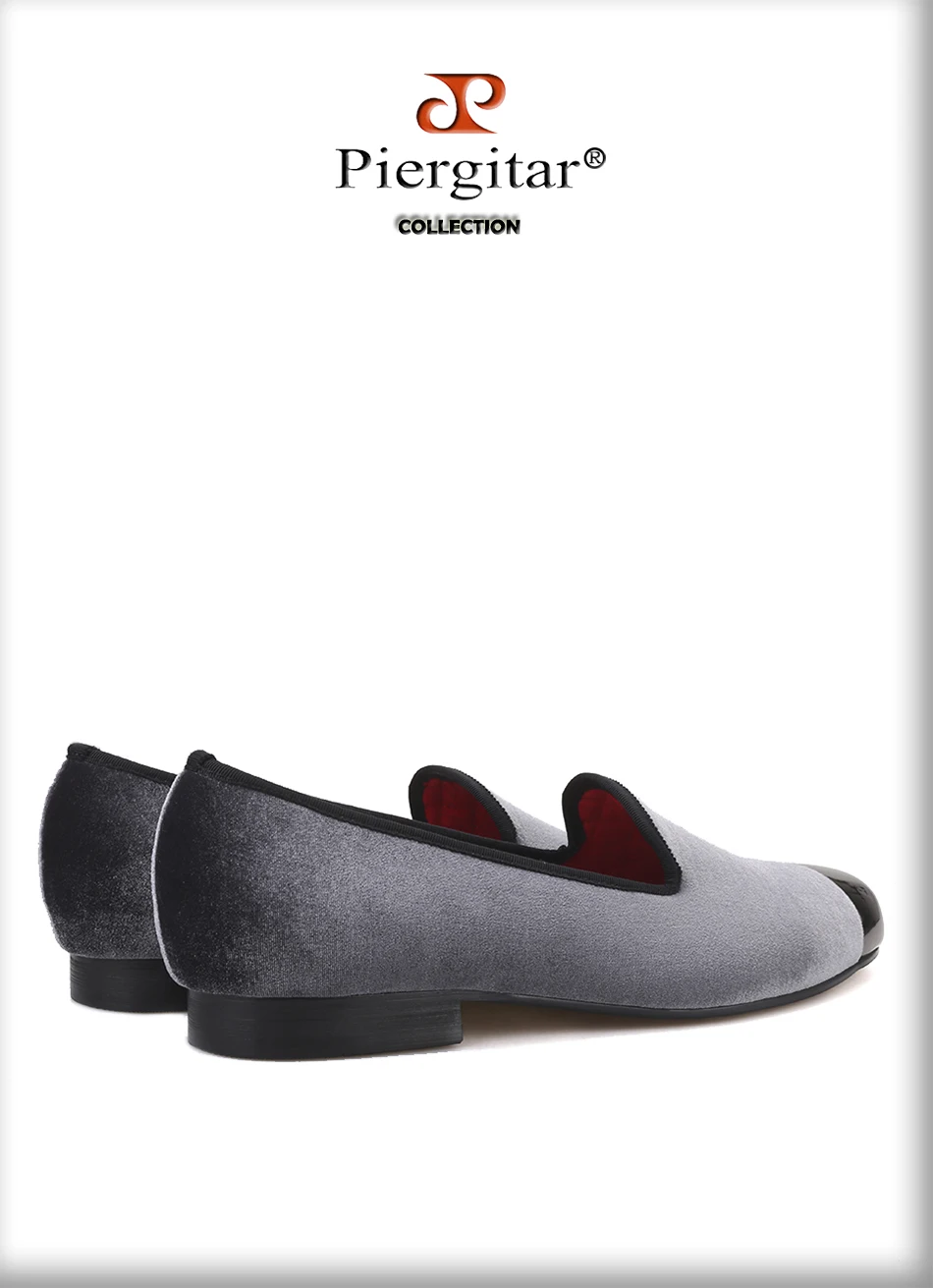 Piergitar gray color men velvet shoes with gun toe metal fashion party and wedding men loafers handmade men's smoking slippers