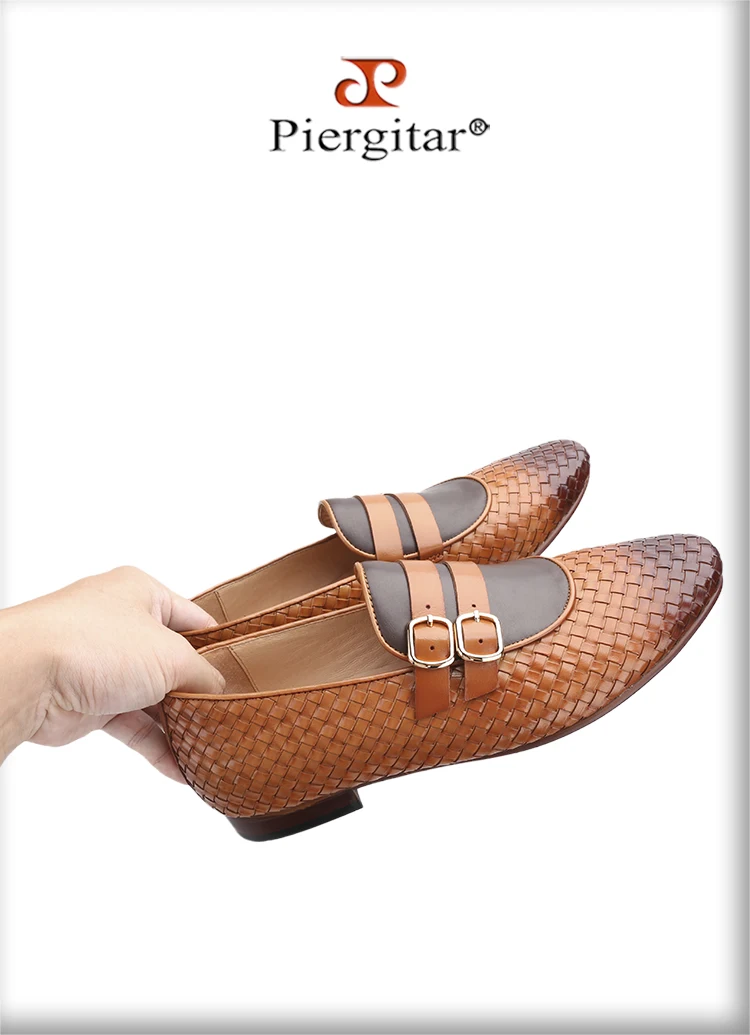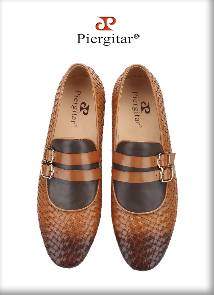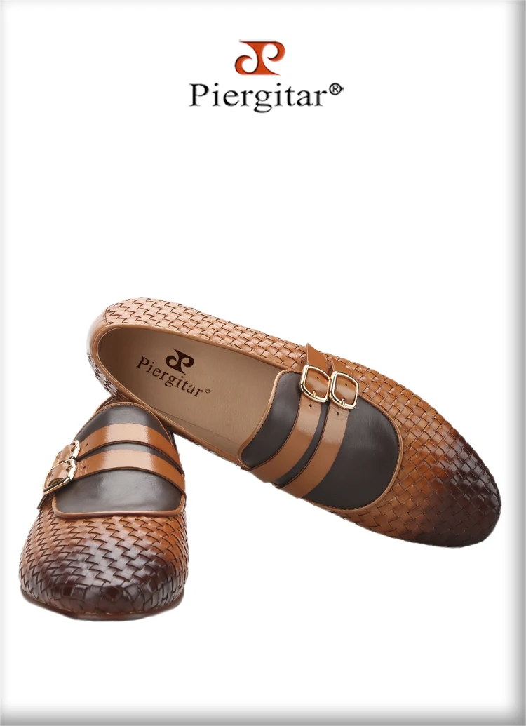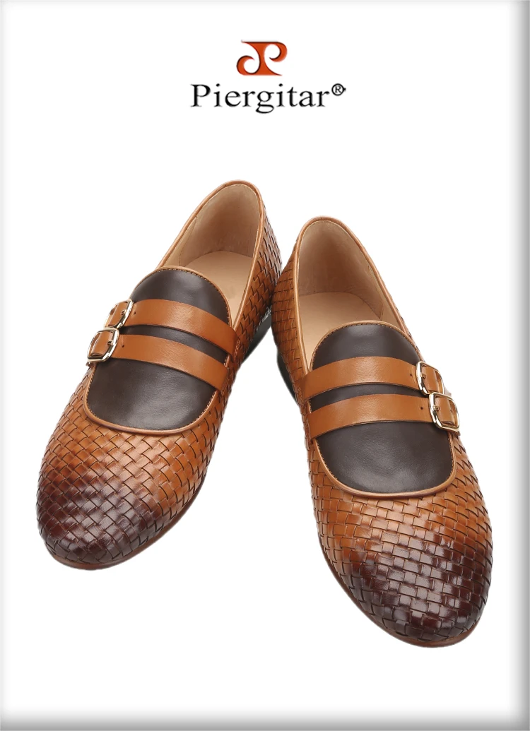 Men's Hand-Rubbed Brown Woven Calfskin Monk Shoes with Cross-Tied Handmade Loafers Genuine Lining