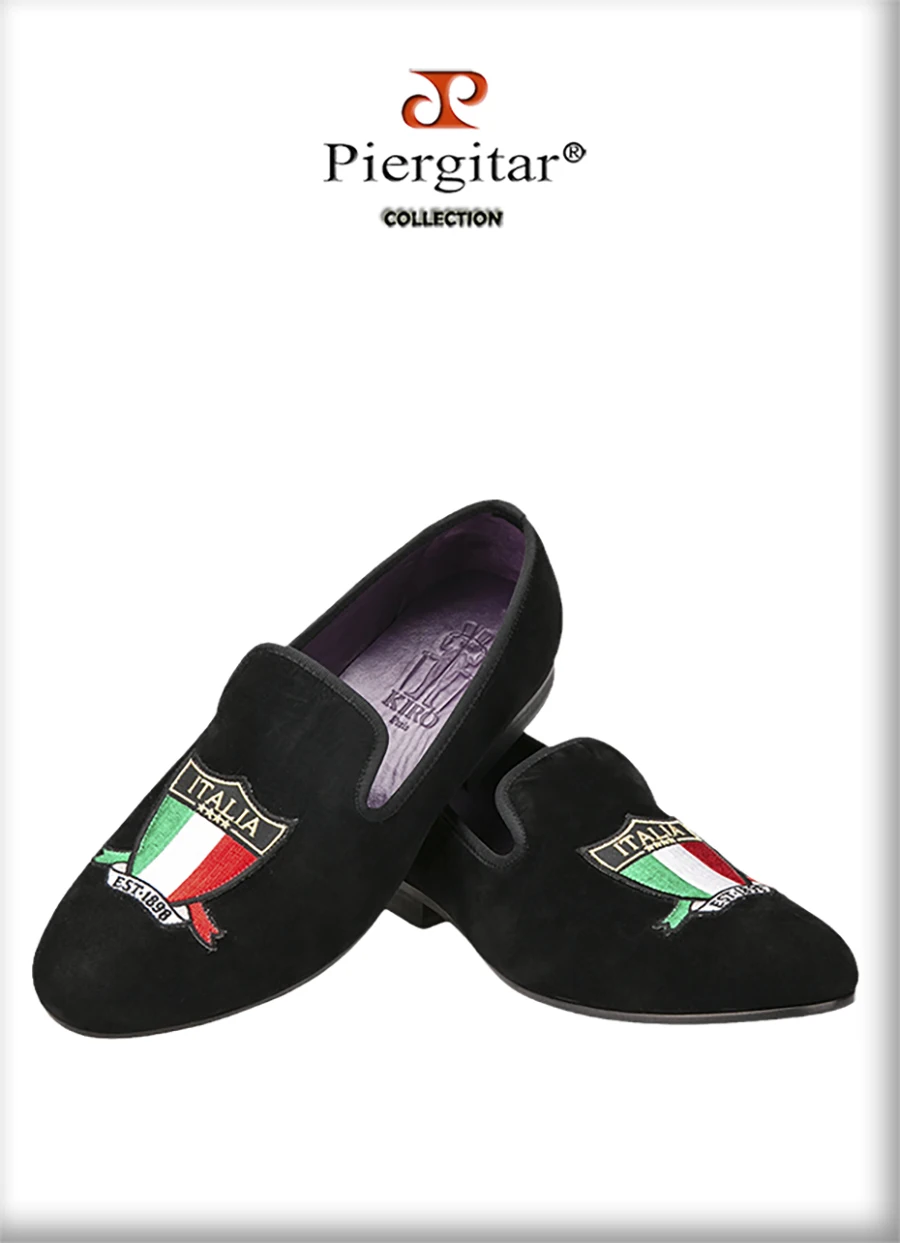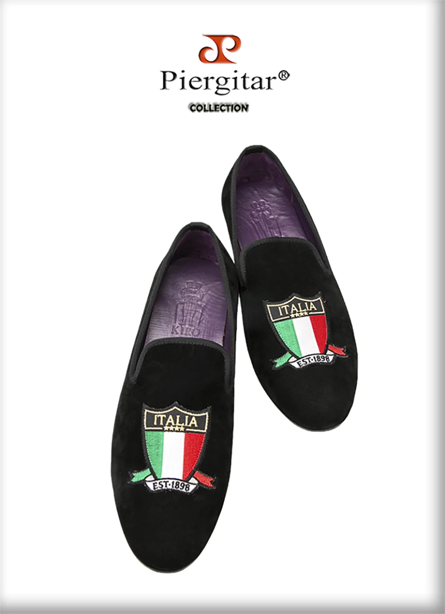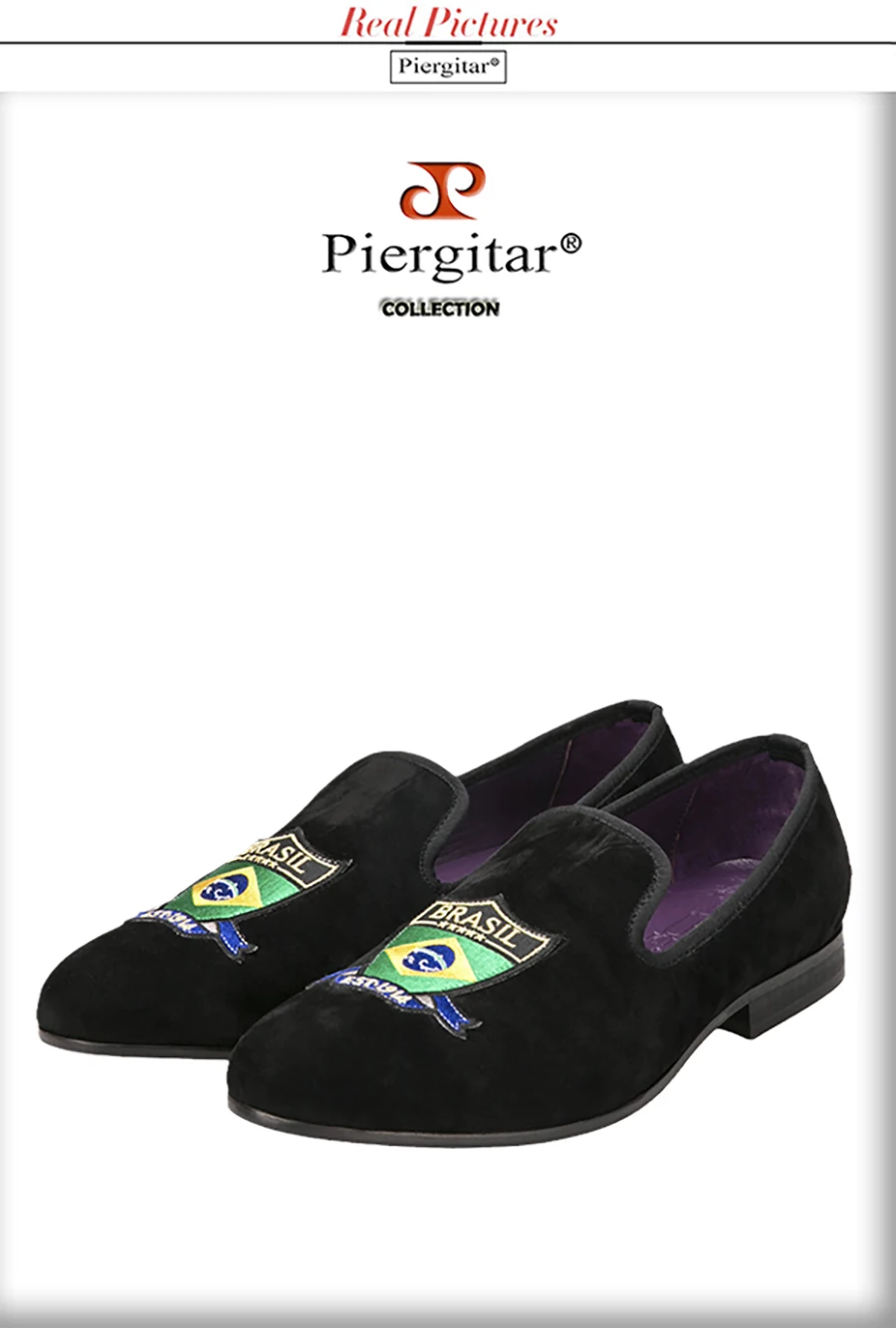 Piergitar Handmade Embroidery Of Four Powerful Football Countries Black Velvet Men Loafers Genuine Leather InSoles And Outsoles