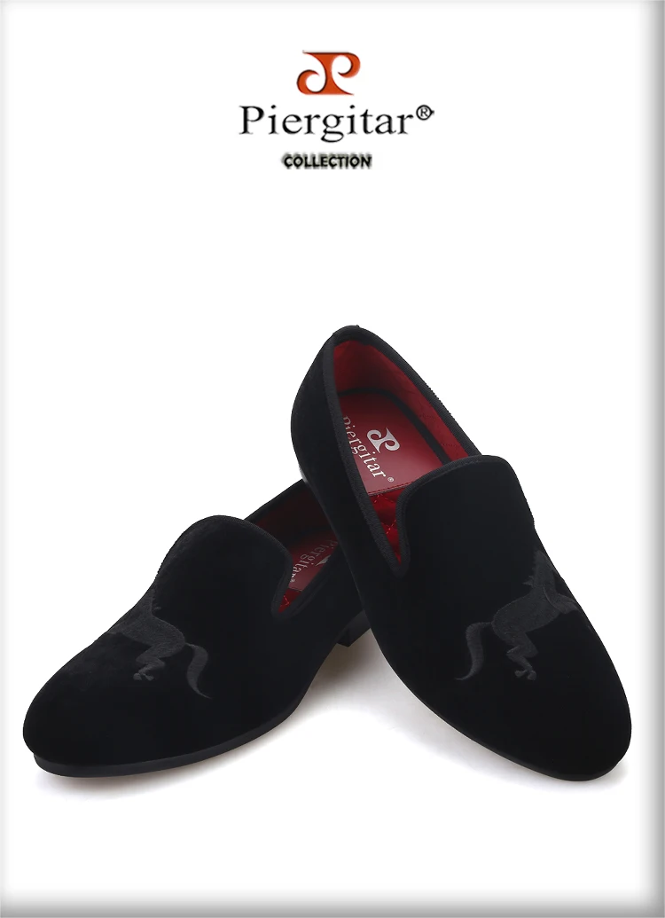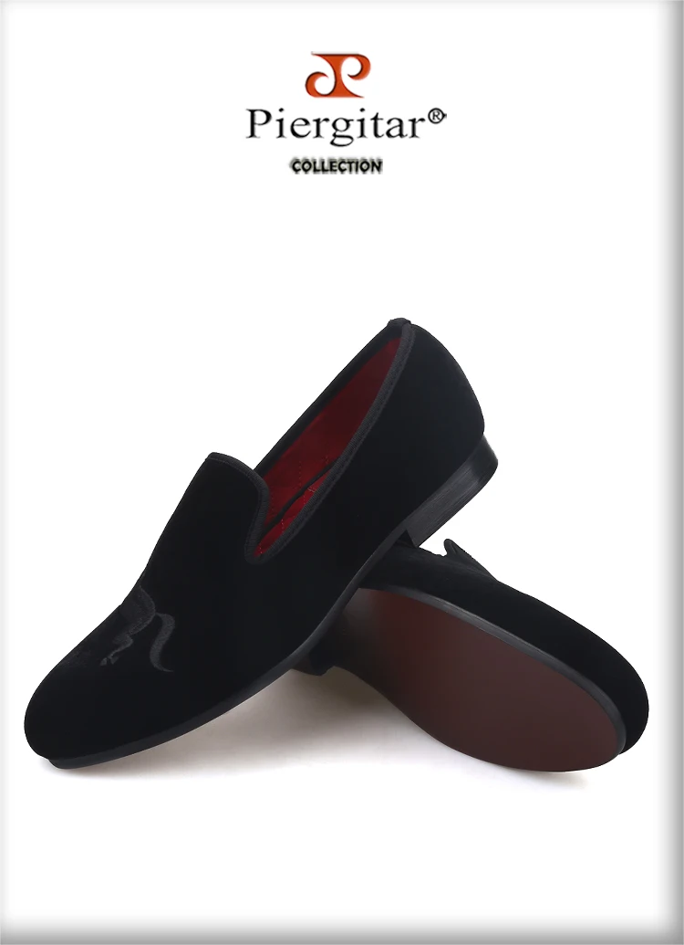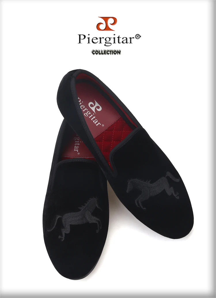 Piergitar High Level Customization Black Velvet Men's Loafers For Party Handmade Horse Embroidery Slip-On Man Smoking Slippers