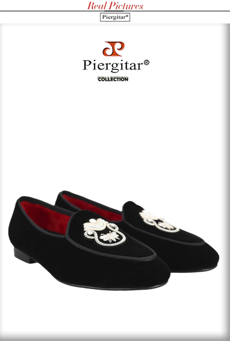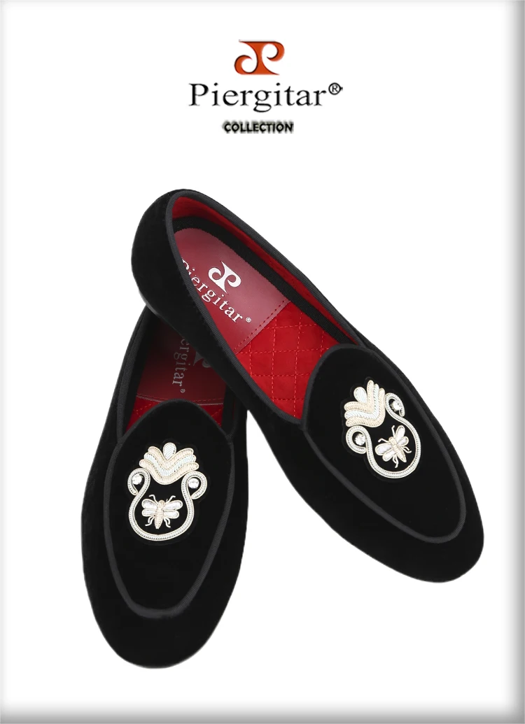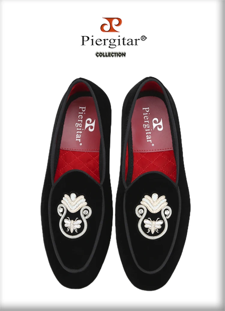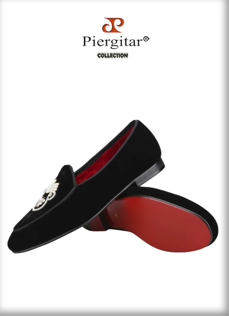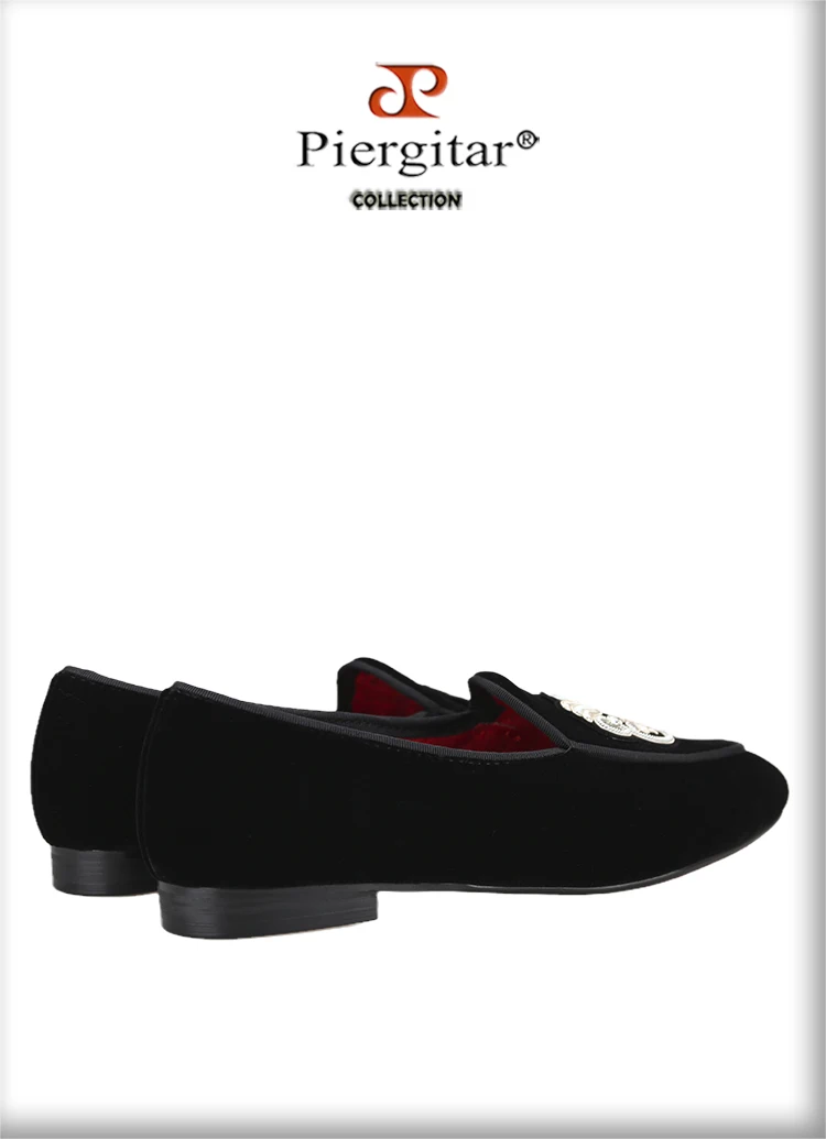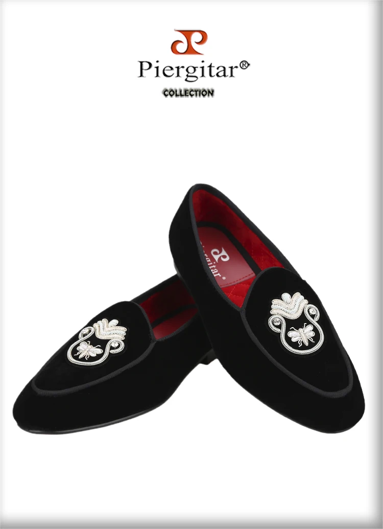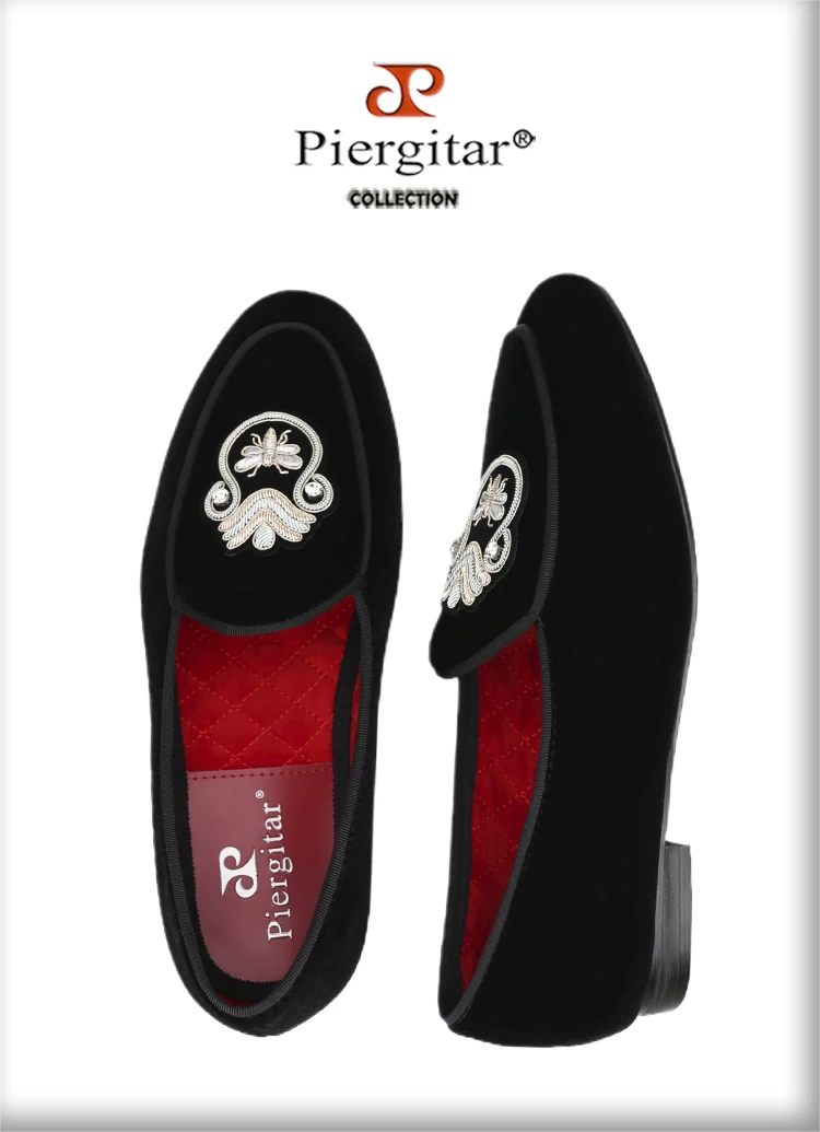 Black Velvet Men's Loafers with Embroidered Bee Rhinestone Patches and Red Outsole