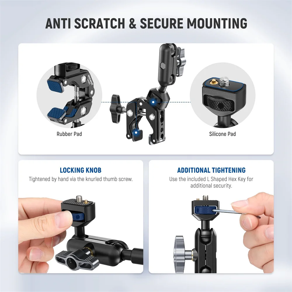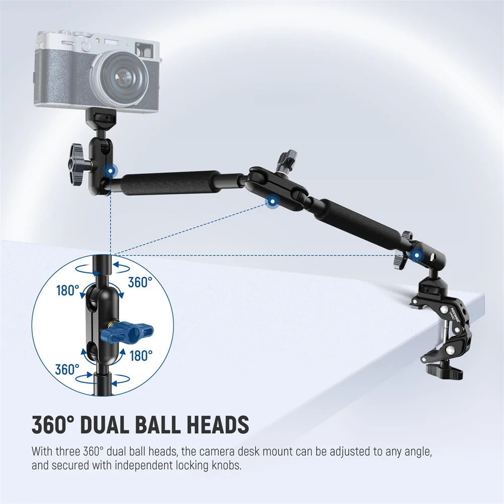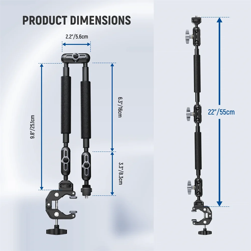- 【Articulating Arm with Ball Heads】 The two section friction boom arm offers a 55cm/22'' extended length, and is equipped with three sets of 360° dual ball head adapters, enhancing the flexibility of angle and height, and secured with a simple twist of the locking knobs. Each ball head comes with multiple rubber rings to firmly grip your gear and prevent accidental drops