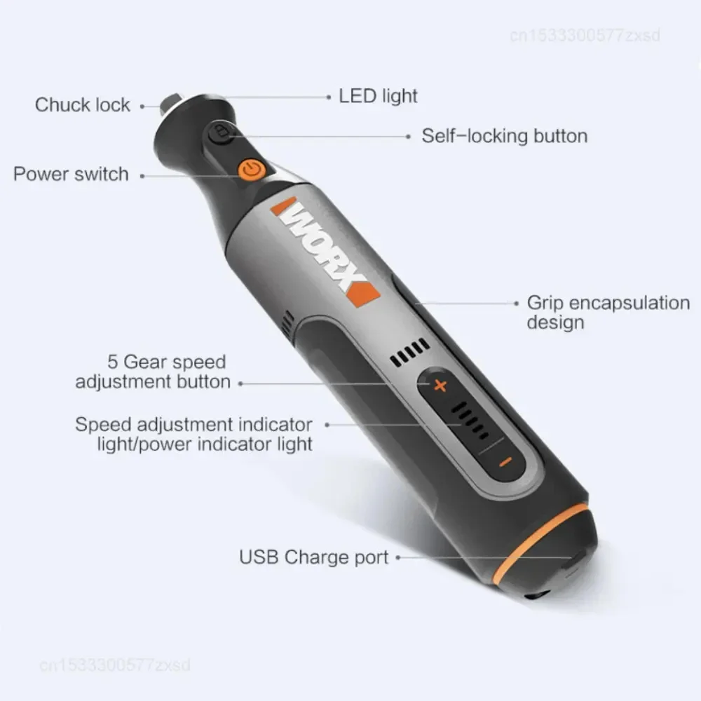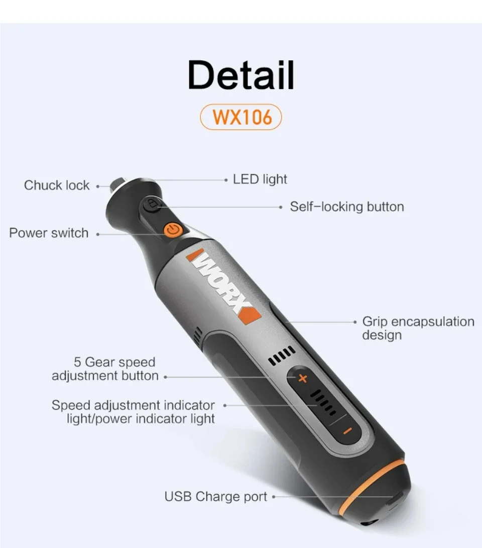 Worx WX106 Rotary Tool 8V Cordless Mini Drill Engraving Grinding Polishing Machine USB Charger Variable Speed Power Tools Set