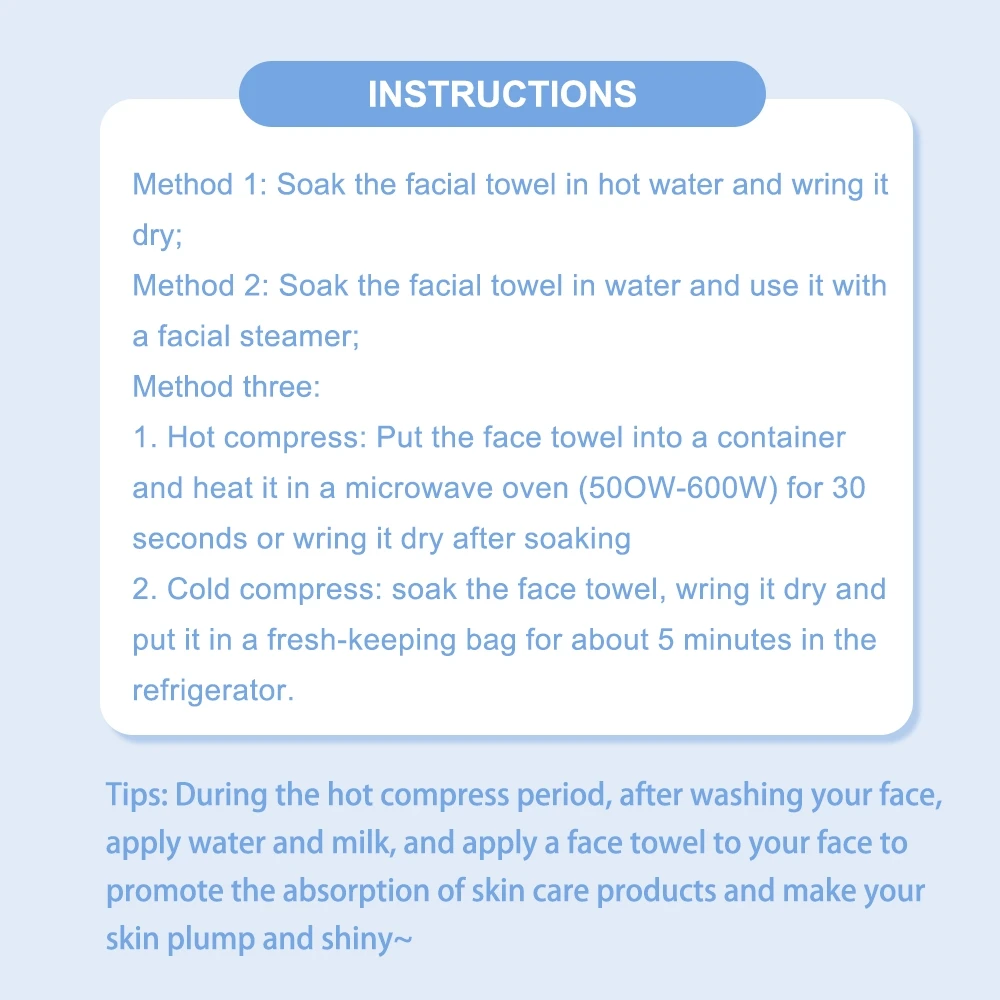 1. Hot compress: put the facial towel into a utensil - microwave oven warm fire (50OW-600W) to heat for 30 seconds or soak it and screw it dry