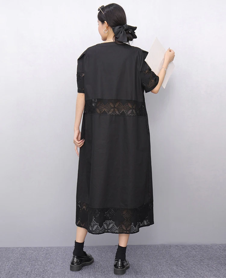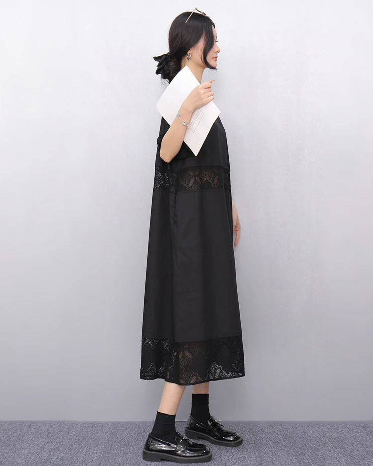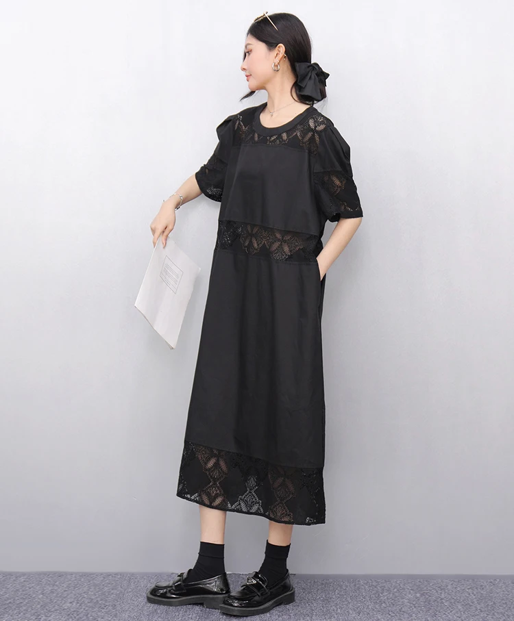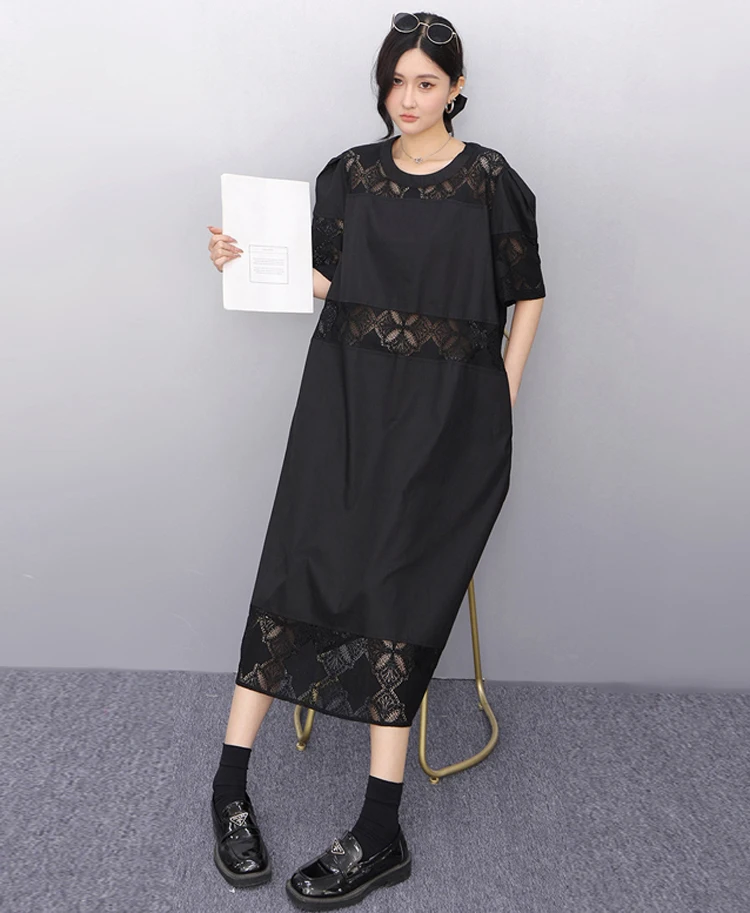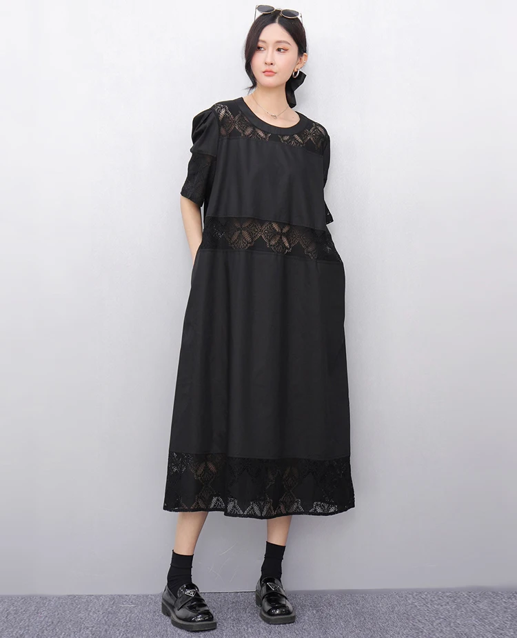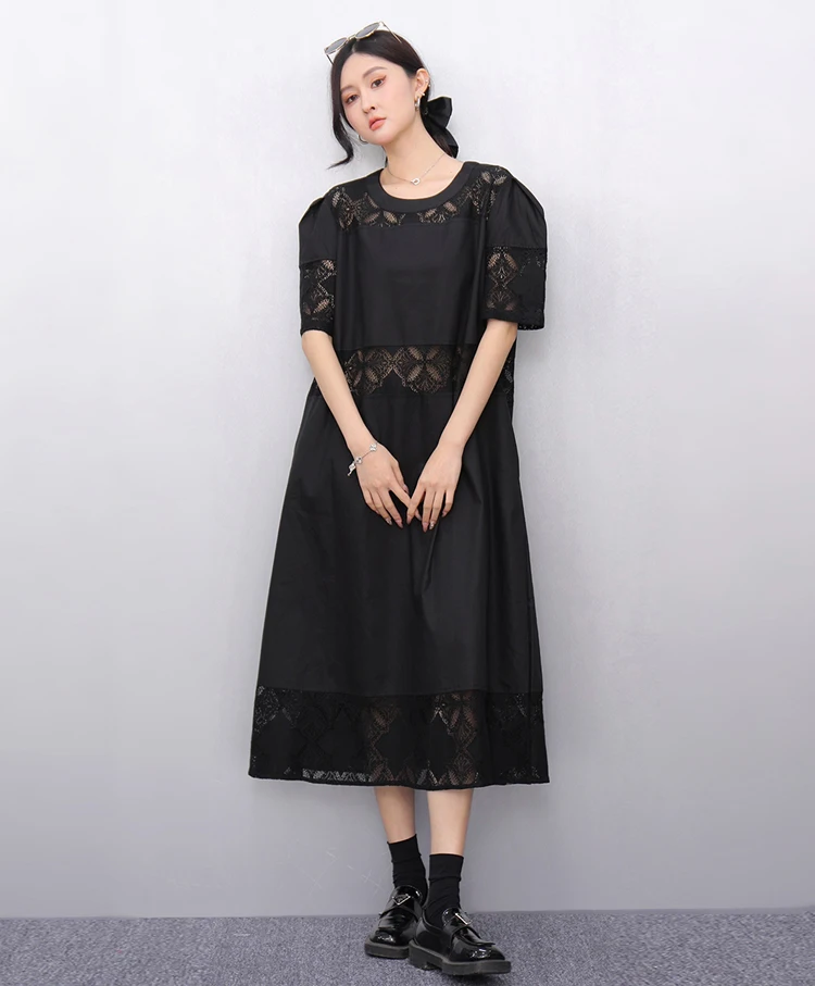 Lace Joined Loose Fit Korean Style Woman 2025 Summer Round Neck Short-Sleeve Black Pullover Dress Gorgeous Big Size Robe JKXD008