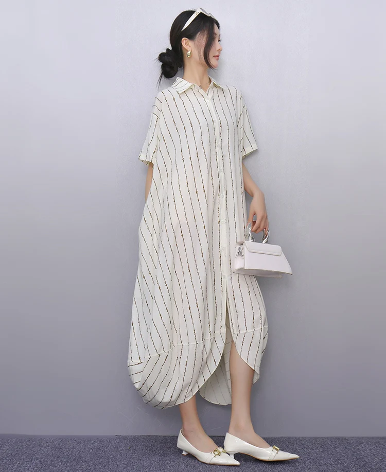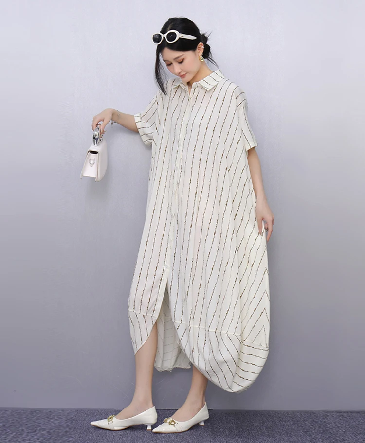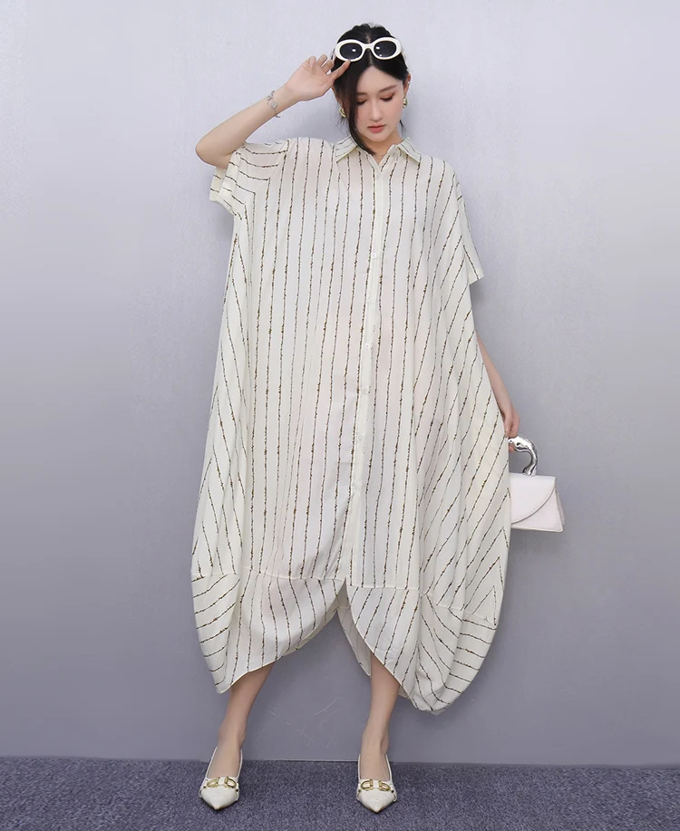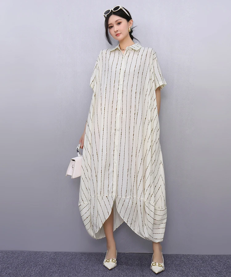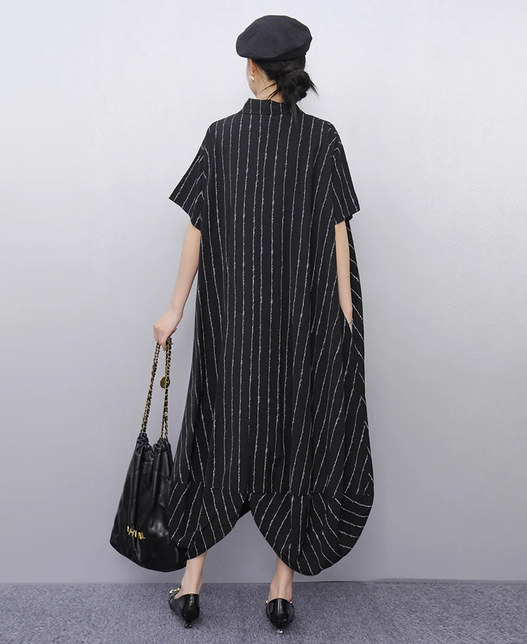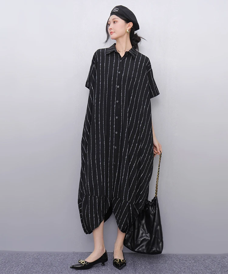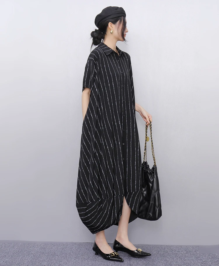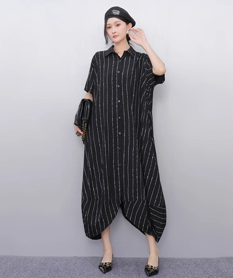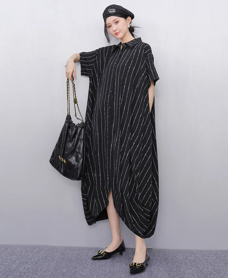 New 2025 Summer Woman Short-Sleeve Black Striped Shirt Dress Loose Fit Chic Big Size Casual Holiday Irregular Large Robe JKXD017