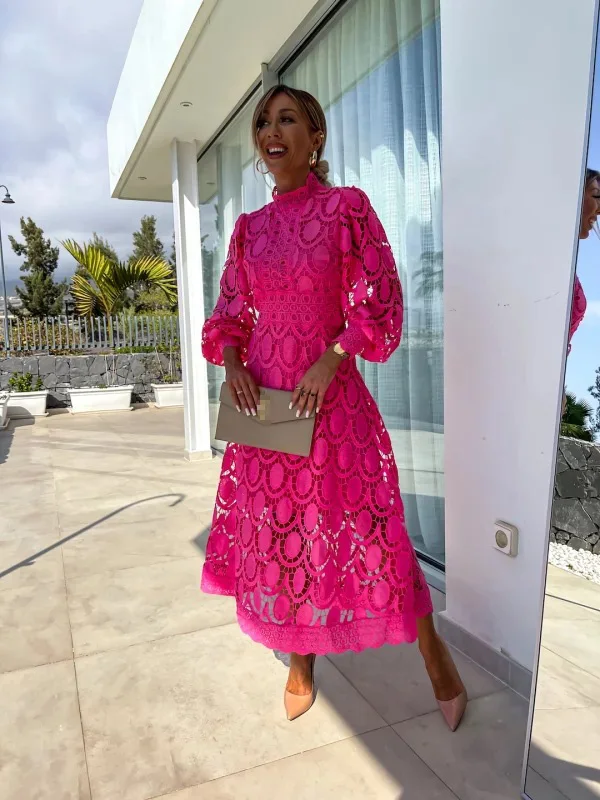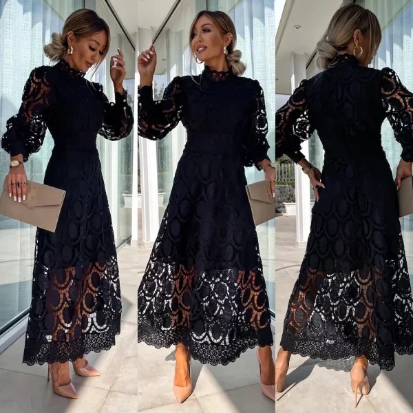 Spring New French Lace Standing Neck Bubble Sleeves Wrapped Waist for Slimming Dress, Elegant European and American Long Dress