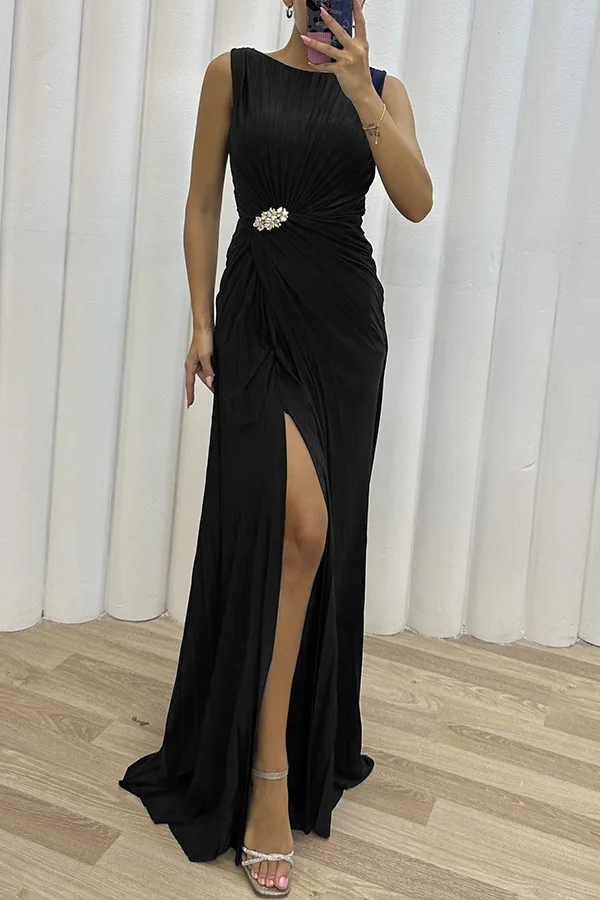 Women Sexy Dress New Sleeveless Solid Party Slim Empire Split Female Elegant Round Neck Fashion Long Clothing