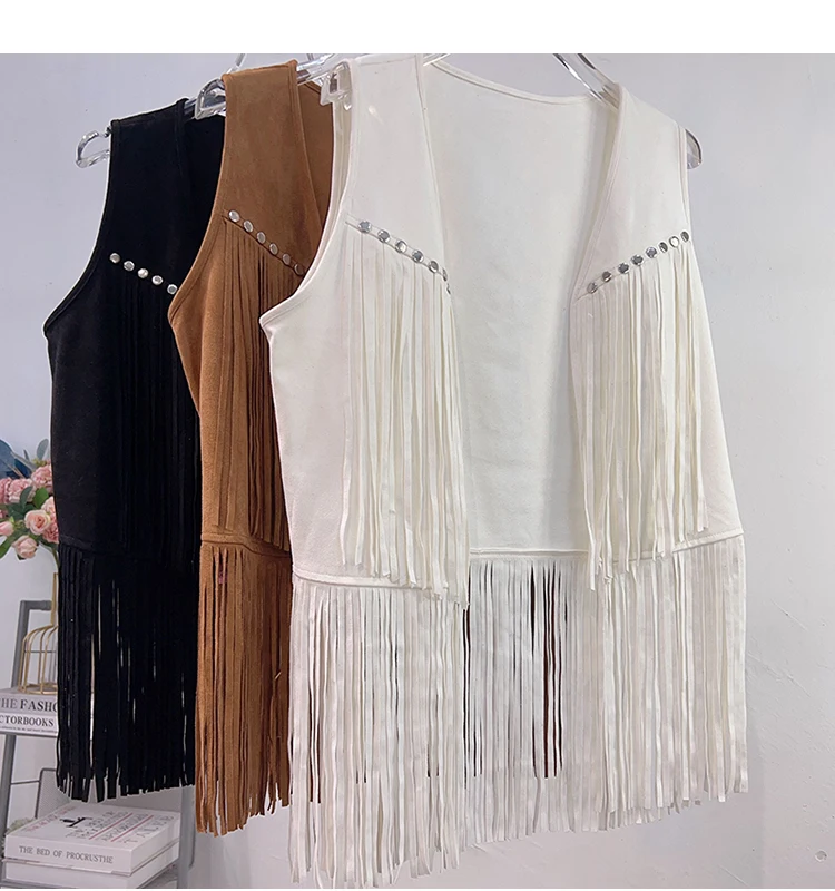 Retro Western Cowboy Style Soft Suede Tassel Vest Spring Autumn Sleeveless Cardigan Women Casual Waistcoat Sweetwear