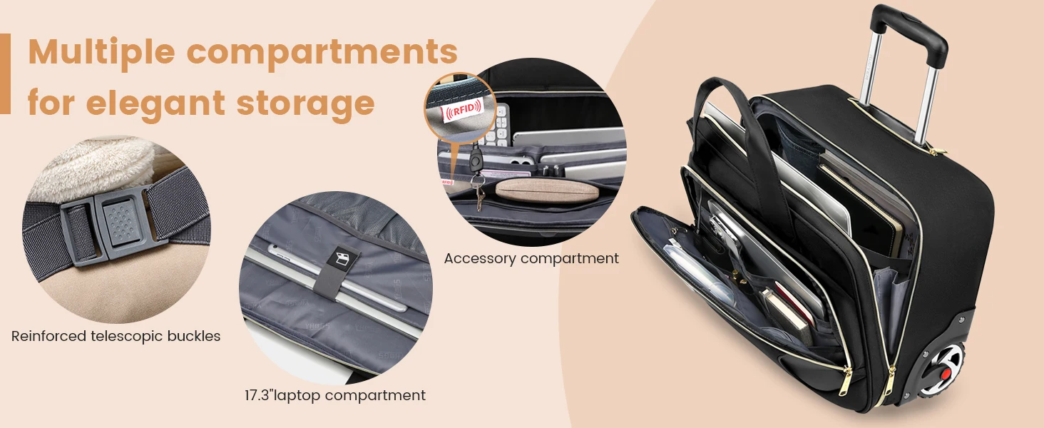 Material: The Rolling laptop bag is constructed of polyster canvas fabric for durability