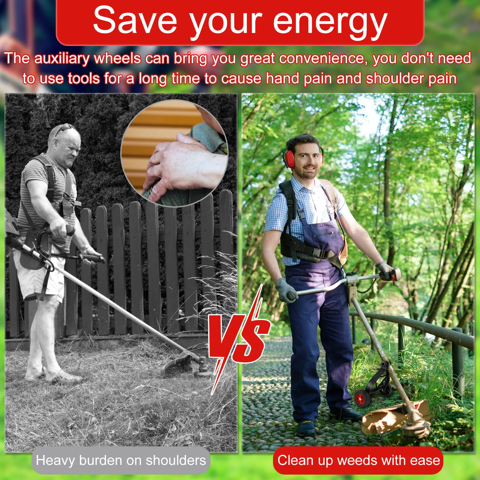 [Labor Saving & Reduce Back Arm Fatigue] Holding tools for a long time can cause sore hands and shoulder pains, with this support wheels can easily solve these problems. Our auxiliary support wheels are designed to share the partial weight of your weed trimmer to reduce pressure on your back, shoulder, and arms, greatly reducing fatigue and pain and making it easier to maneuver the machine.